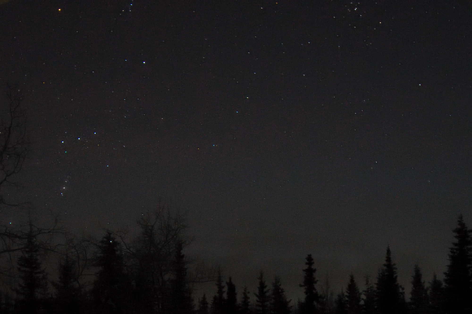 Okay that picture was taken last night about midnight 12:08 AM on the Thirteenth of February. It was taken out my window just before bed. I was hoping that if I woke up with an urge to you know what, that it would still be clear out and I could get a better shot so I left my camera in place and ready to snap another picture. Unfortunately it clouded over during the night and the stars disappeared.