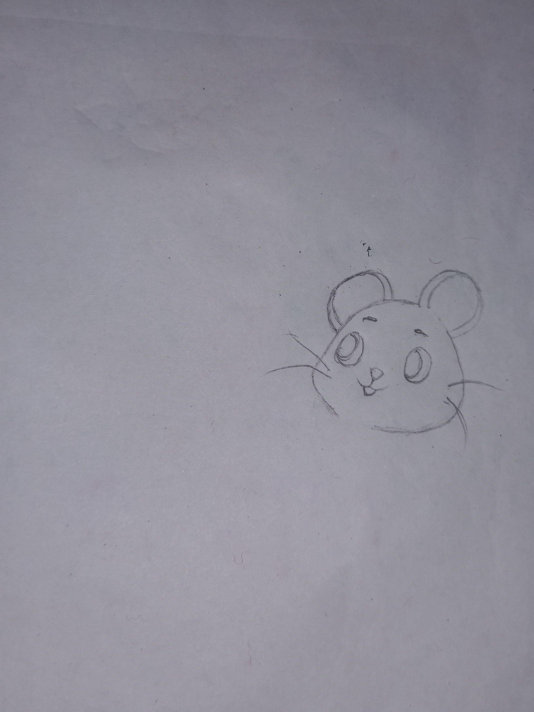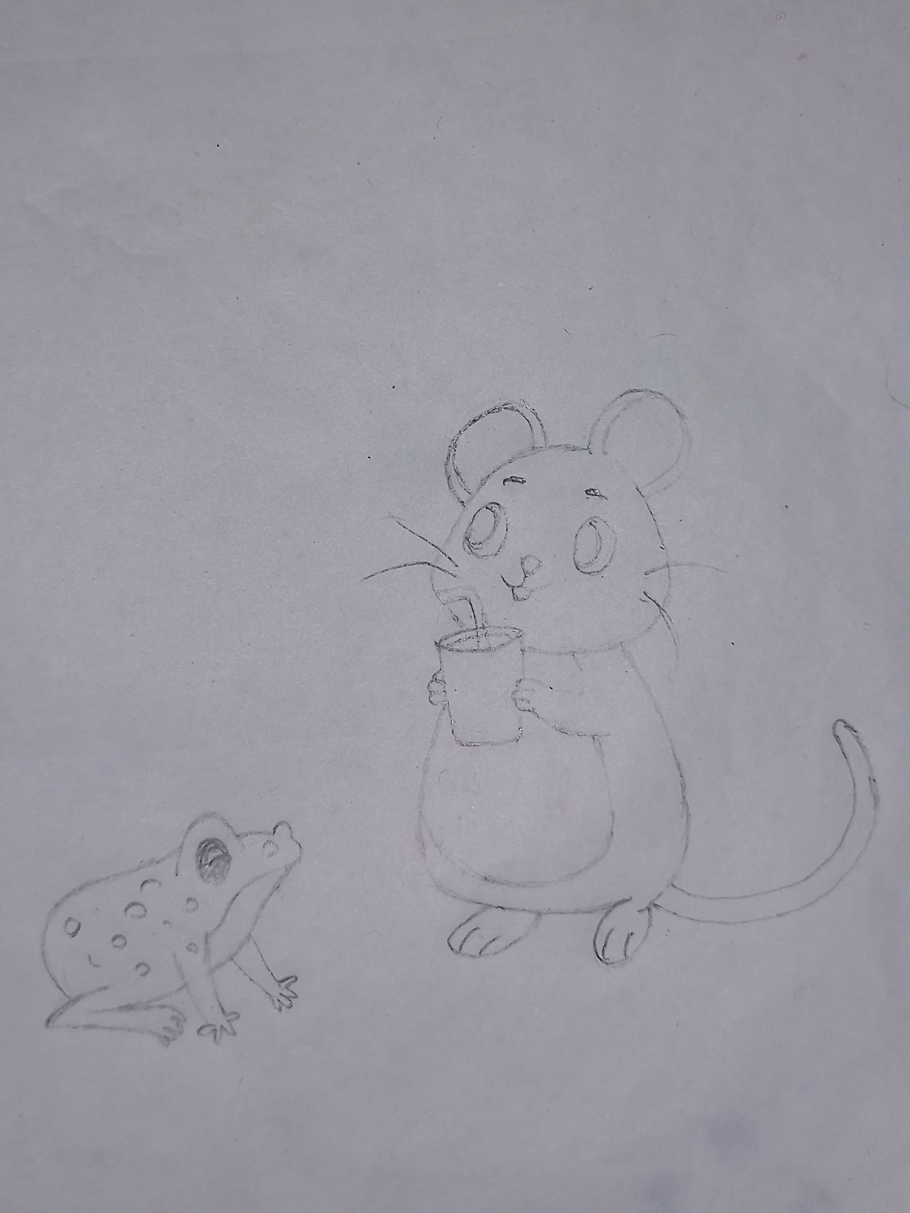 Then draw a small frog facing to the rabbit. Draw its curve mouth and curve eye area. Draw a curve neck area and three legs that are seen. Each foot has four fingers.