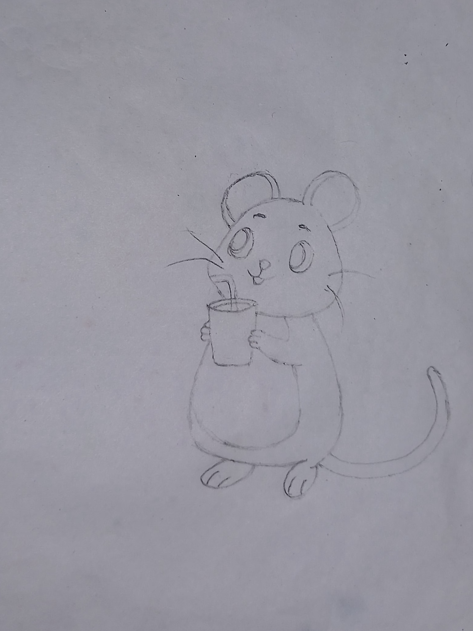 At first draw the round shape face of a rabbit. Draw its two eyes, two ears, one nose and mouth. Draw its two hands holding a glass of juice. Draw its curve belly and curve back side. Draw one curve tail and two feet.