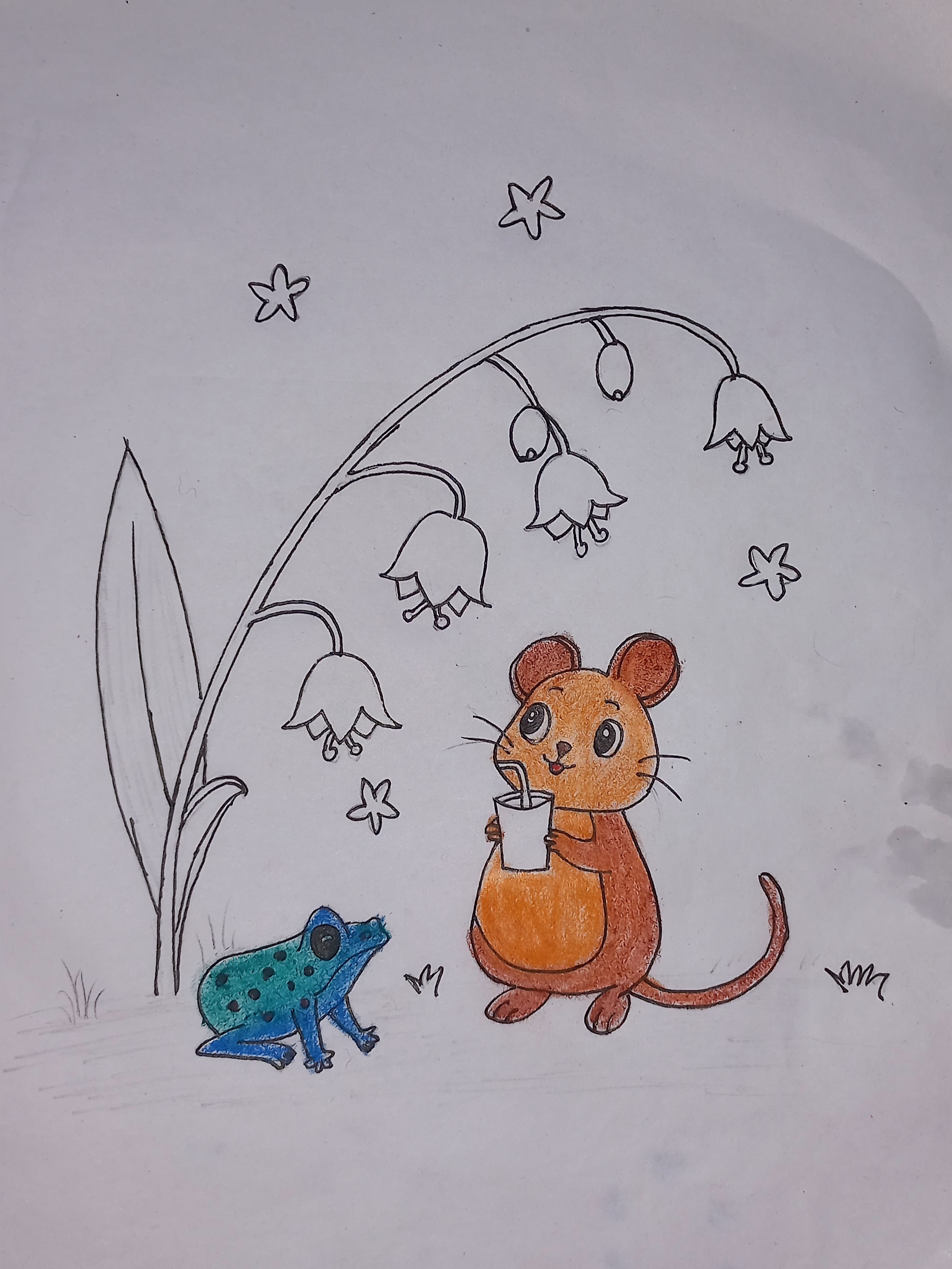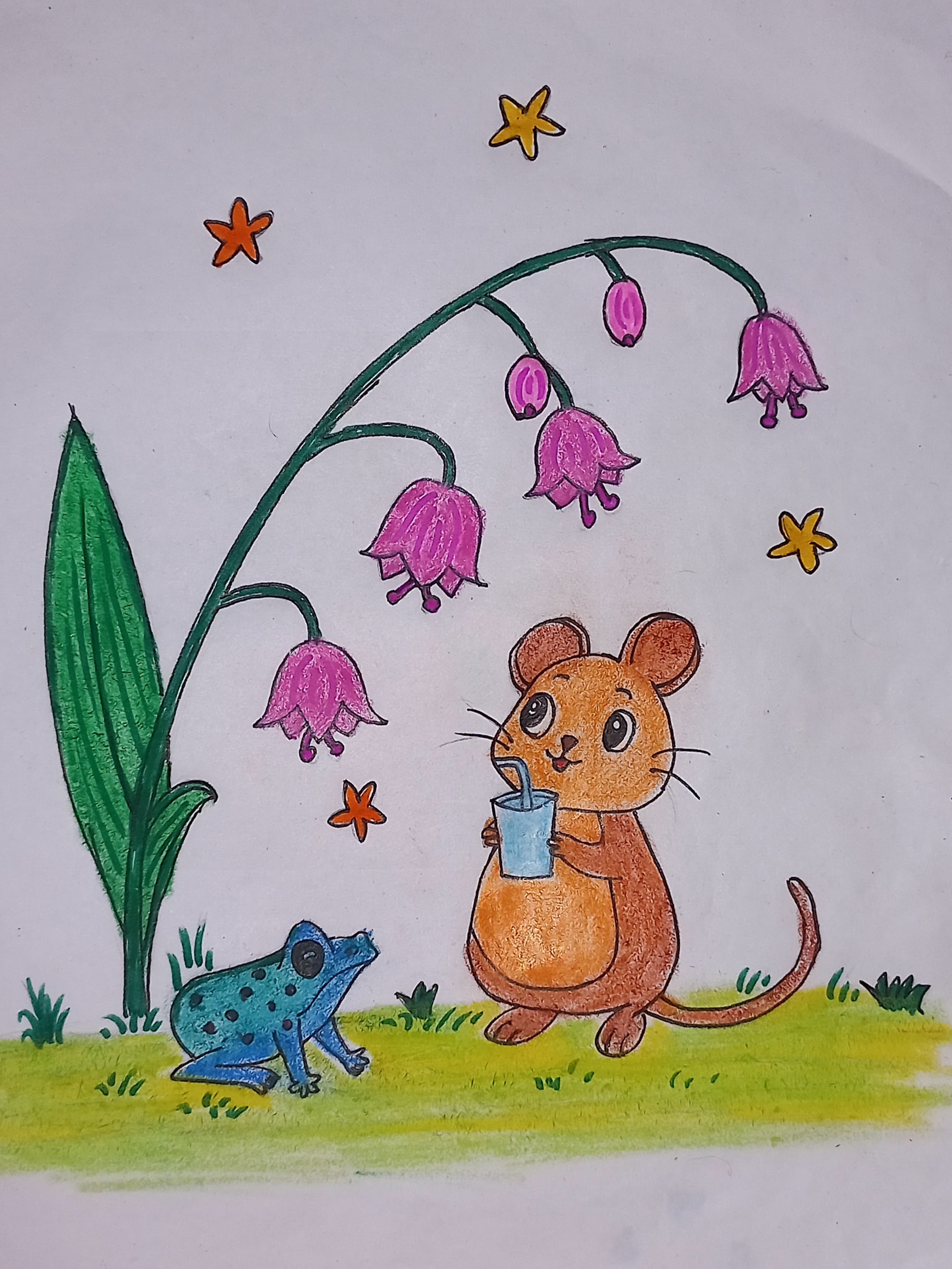 Now paint the rabbit with chocolate and orange pastel colors. Paint the frog with green and blue pastel colors. Paint the juice glass with sky blue color. Paint the plant leaves with green color and the flowers with purple and pink colors. Paint the stars with yellow and orange colors. Paint the grassland with yellow and green colors.