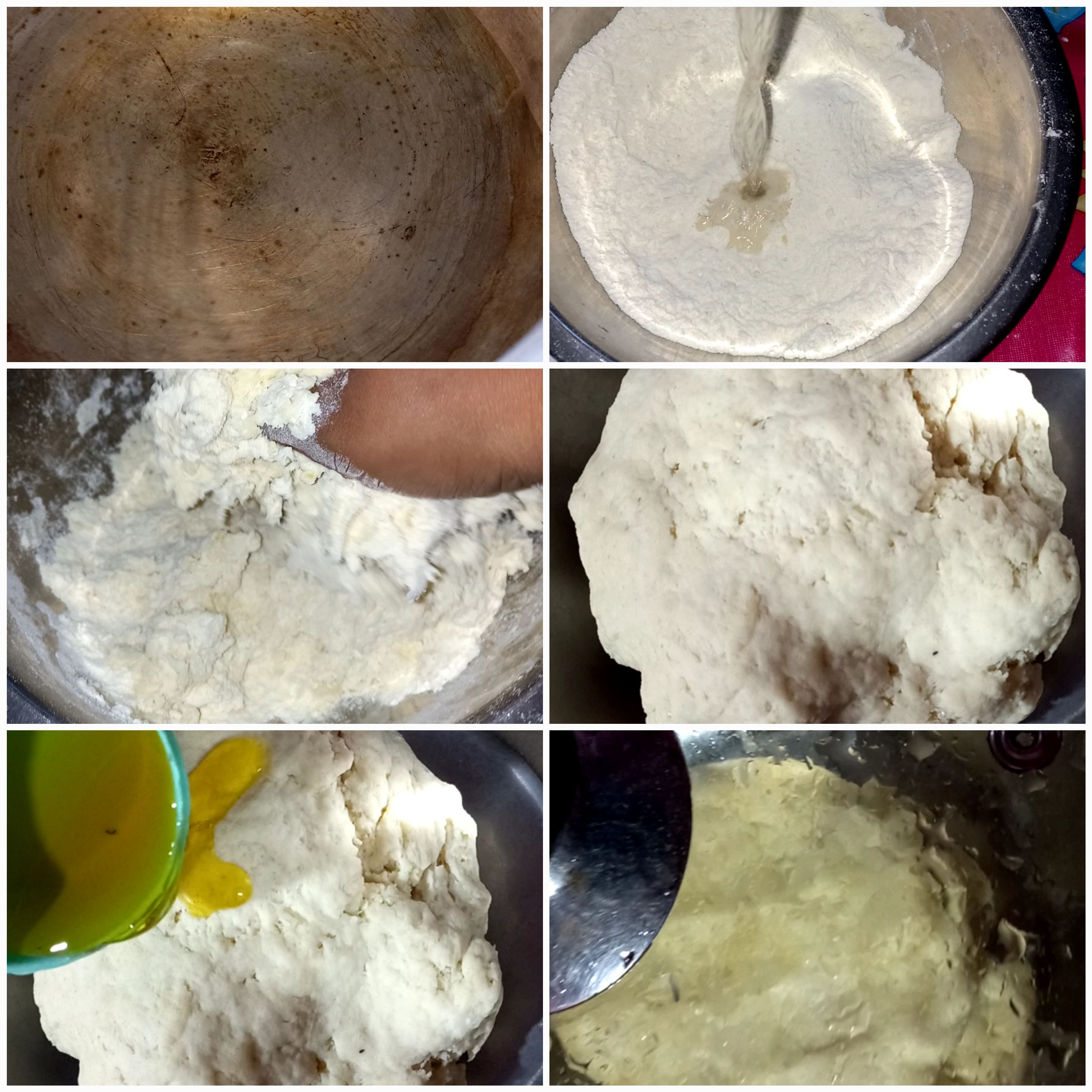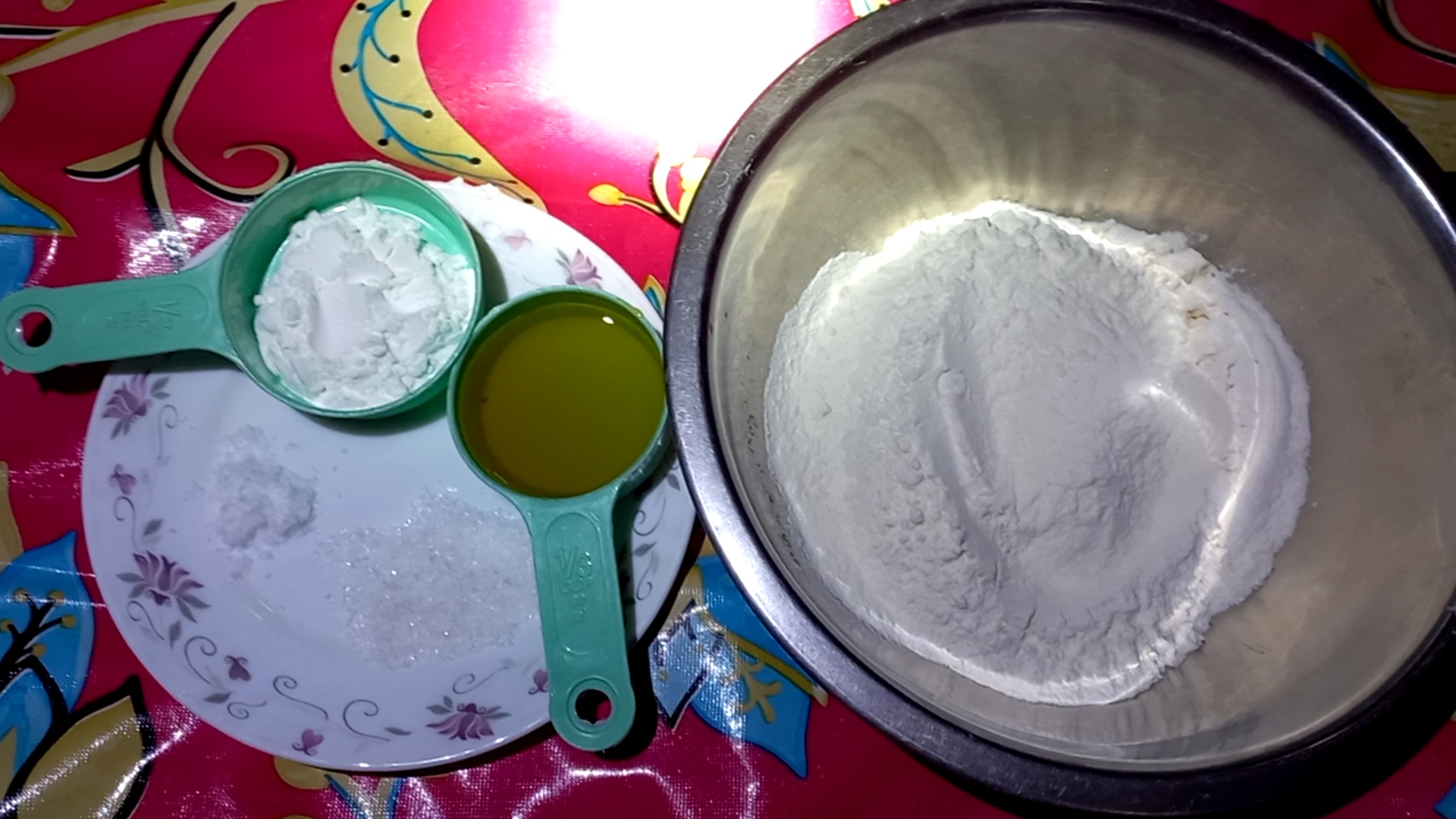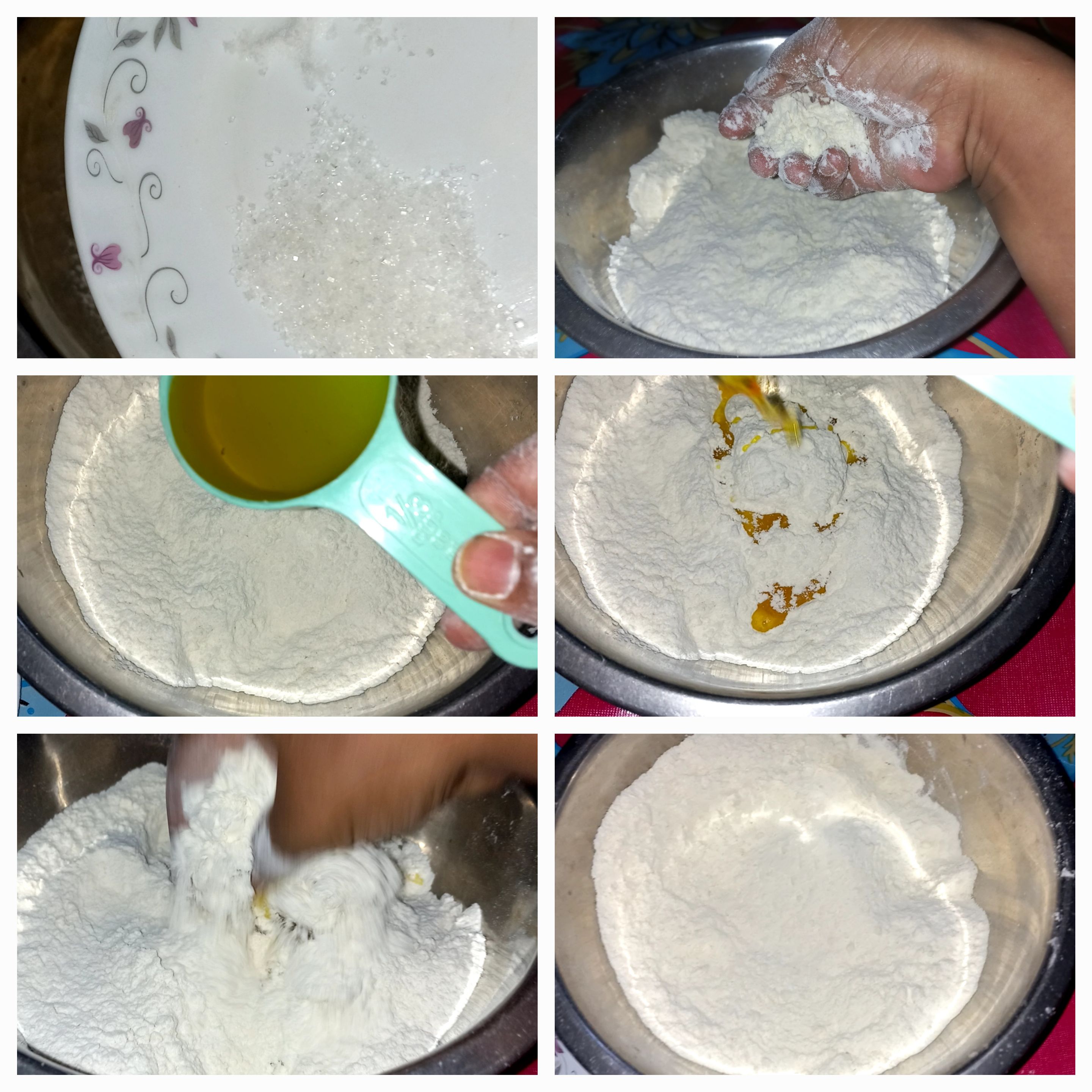 First I added sugar and salt to the flour. Then I mixed it well. Then I added a little oil and mixed everything well again for a while.