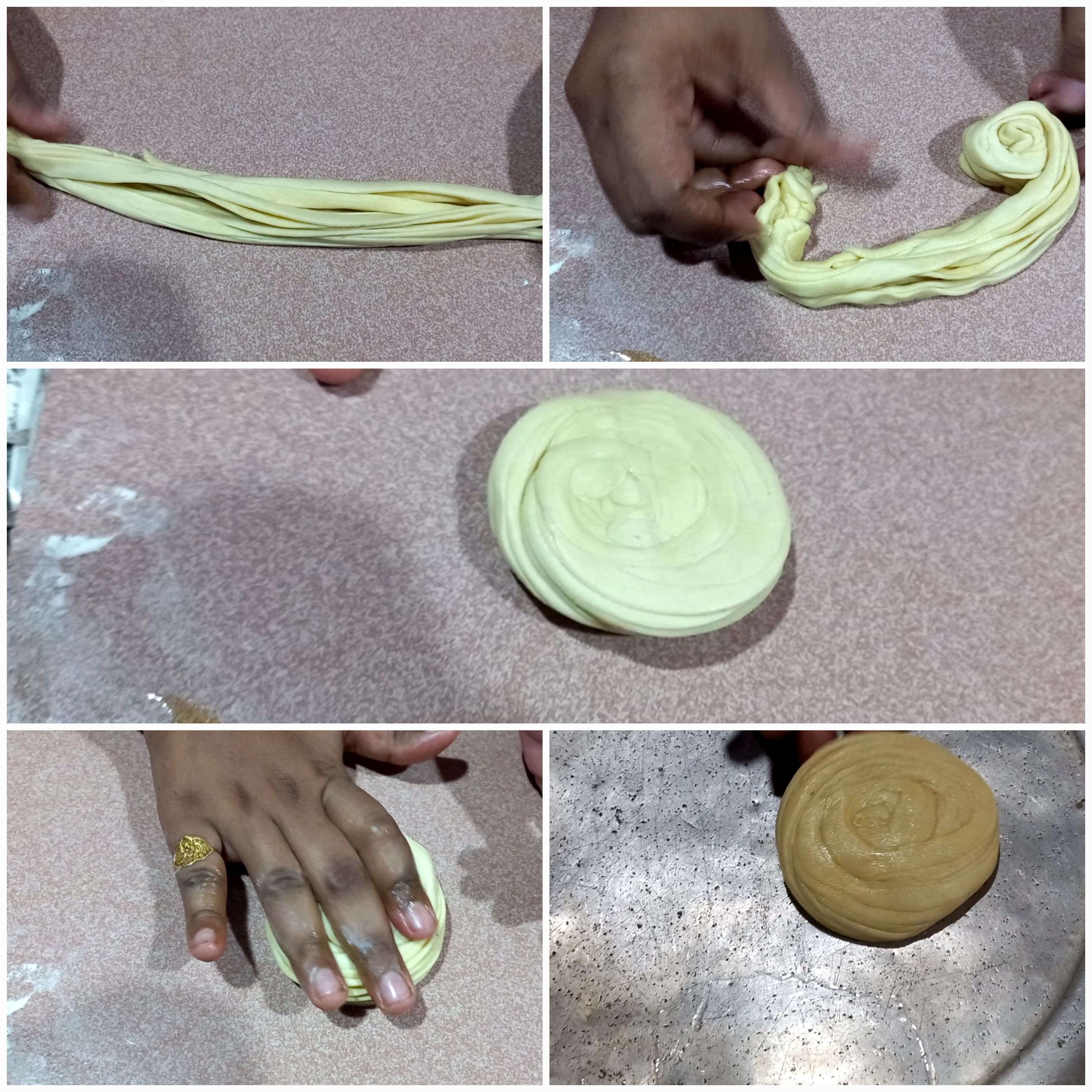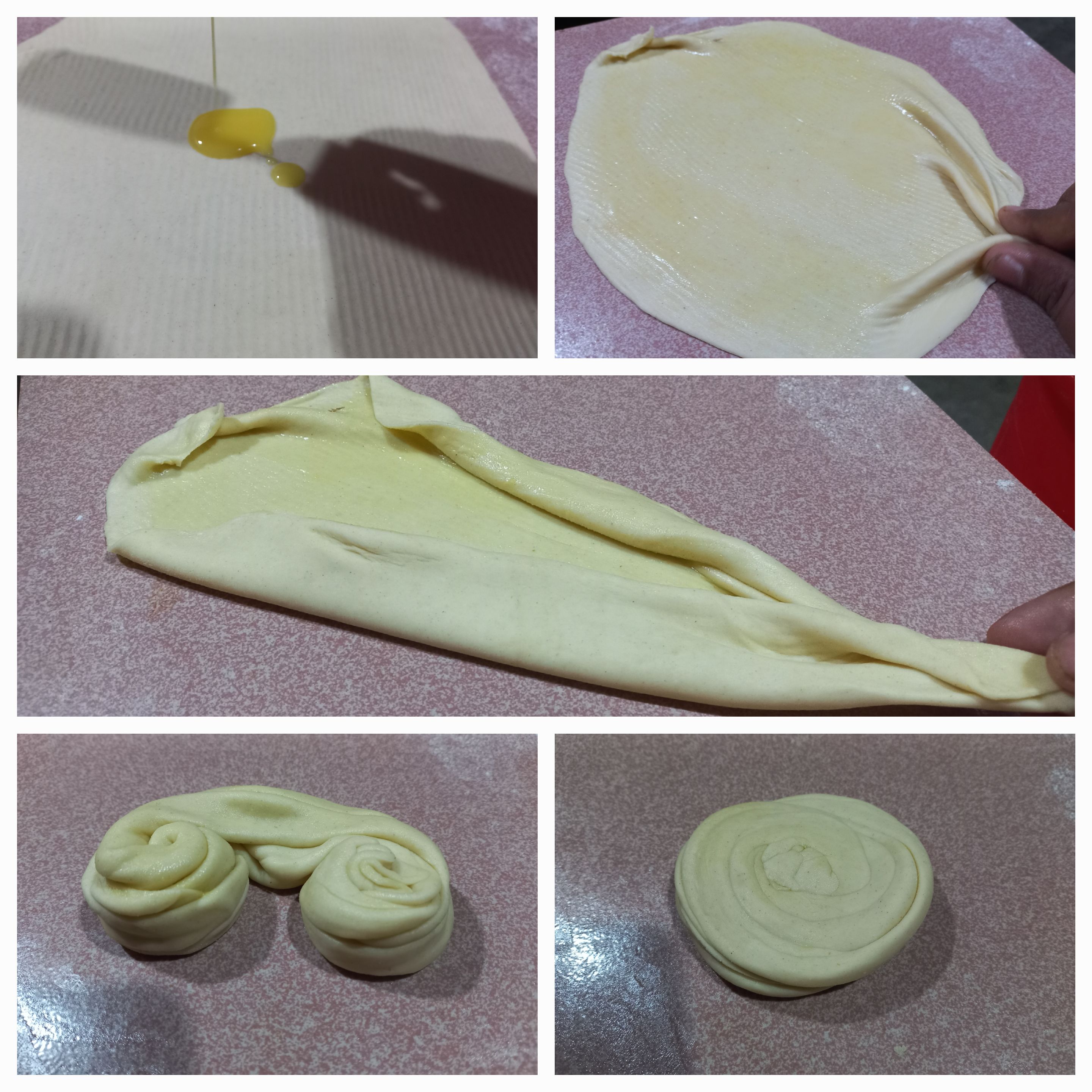 Now I took the parathas from all sides and folded them lengthwise. Then I made round shapes from both sides and brought them together in the middle to make the shape of laccha paratha. After making it, I greased it with oil mixed with cornflour and then kept it for rest for about 10 minutes.