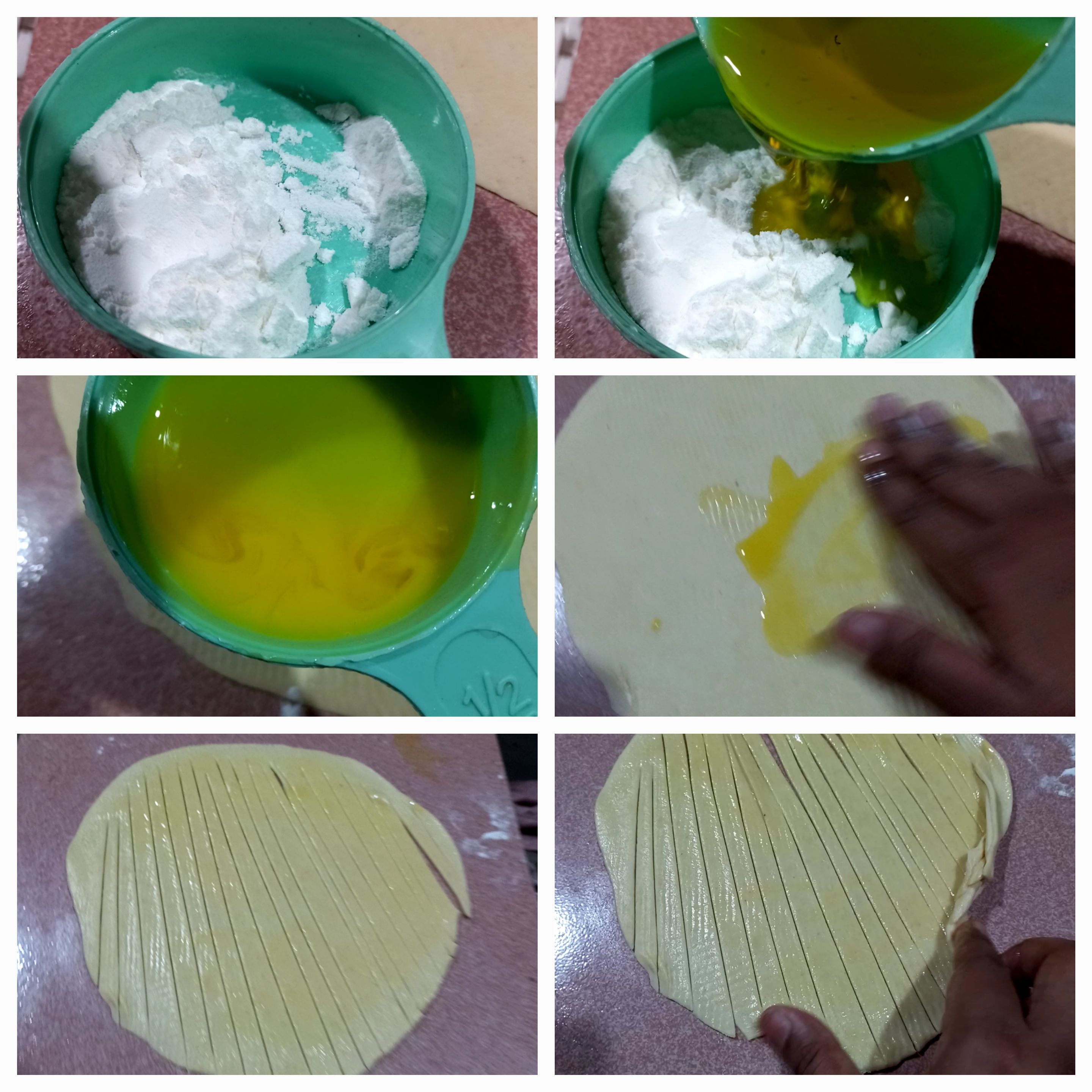 Here I made it in a different way. First I poured oil mixed with cornflour on it. Then, without cutting it, I basically folded it into a round shape.