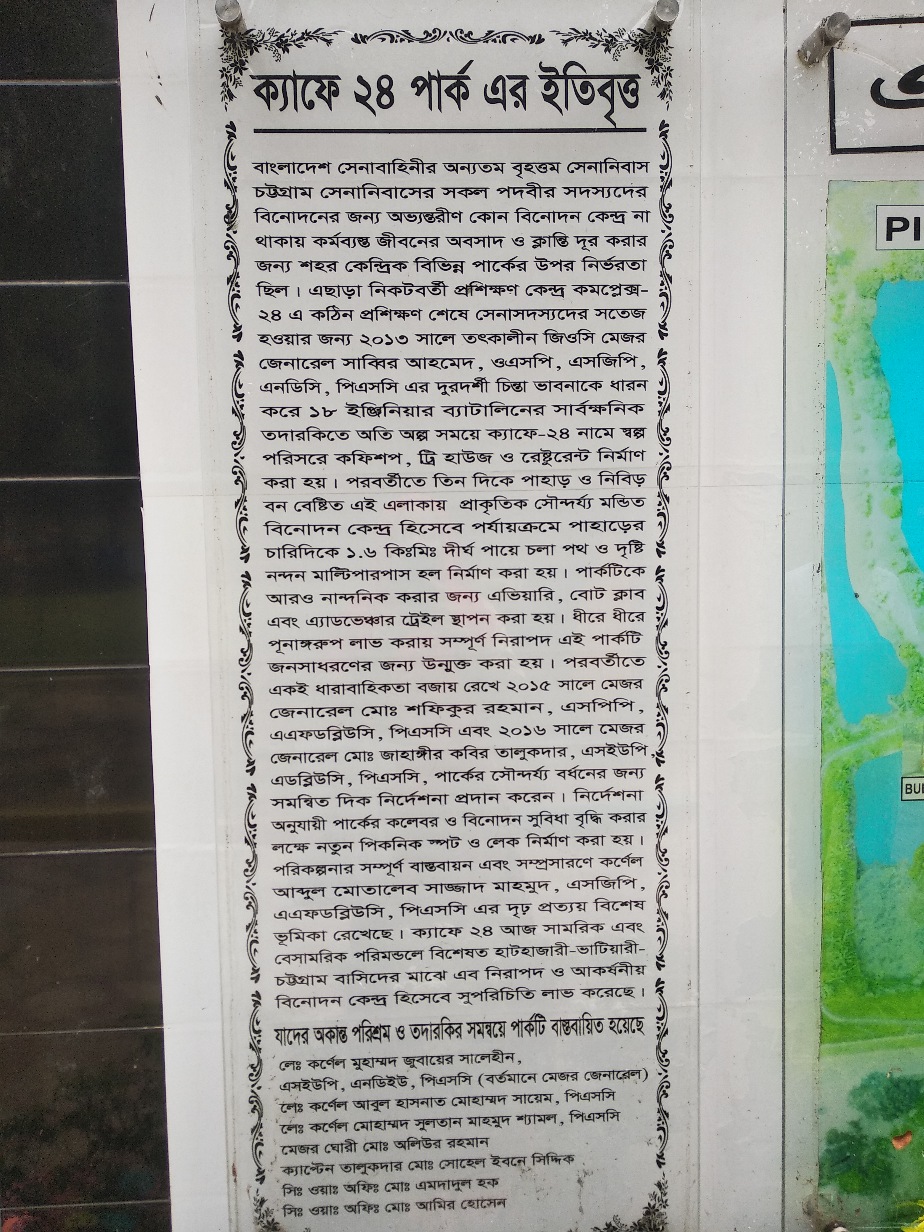 Surrounded by natural beauty, Hillview Park and Cafe is a park run by the Bangladesh Army. "Cafe 24" was launched in 2013 for the entertainment of the army personnel working in the Chittagong Cantonment. Later, a 1.6-kilometer-long walking path and a multipurpose hall were constructed by the efforts of the army personnel on the hill and its name was changed to "Hillview Park and Cafe". Later, in 2015-16, a boat club, aviary, picnic spot, and adventurous trail were established in the park.