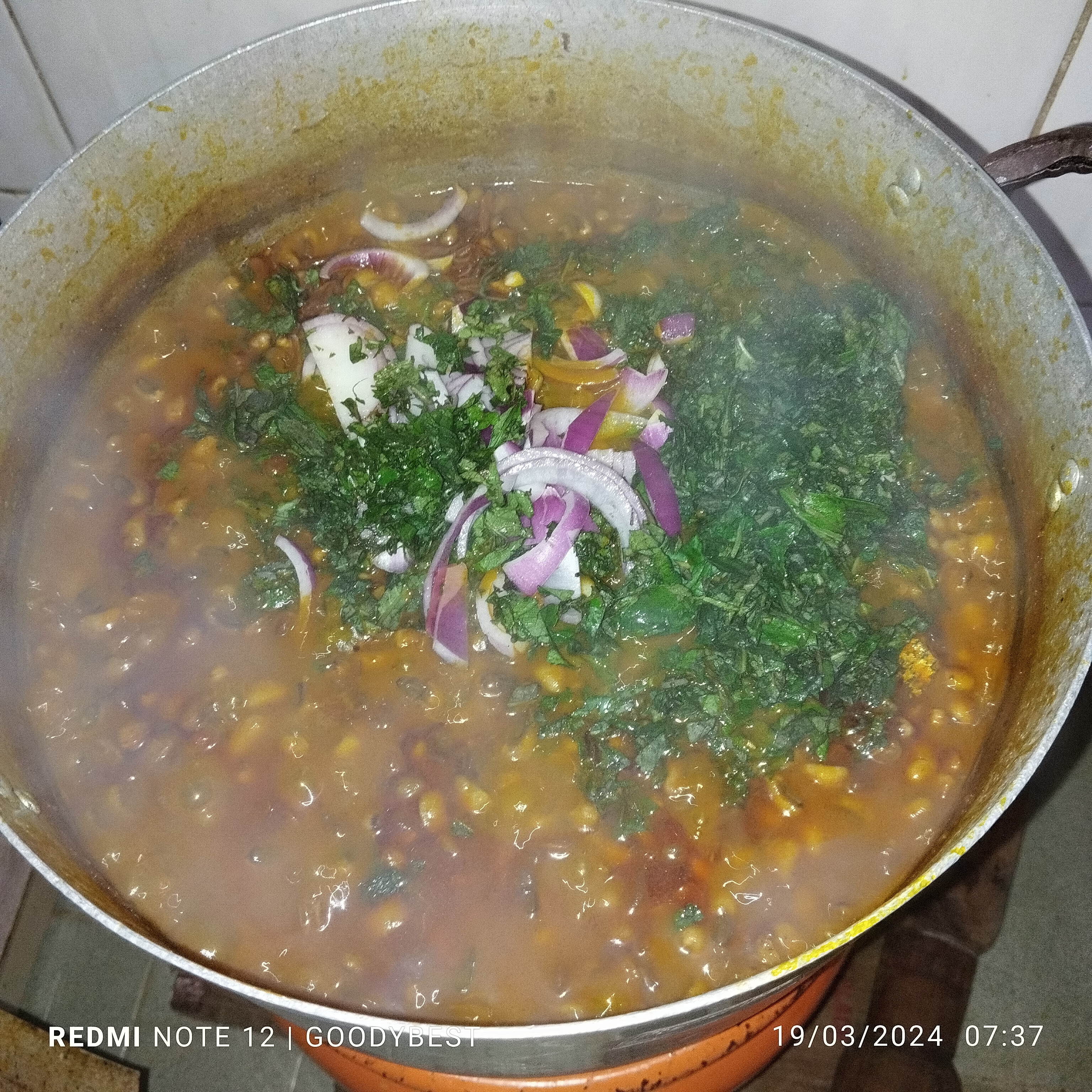 - Allow the food to simmer for some minutes until the water gets dried, then wash and chop your scent leaves and onion and add them.
