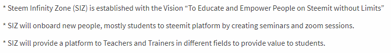 Steem Infinity Zone (SIZ) is established with the Vision “To Educate and Empower People on Steemit without Limits”. SIZ will onboard new people, mostly students to steemit platform by creating seminars, zoom sessions and steemit education tutorials.