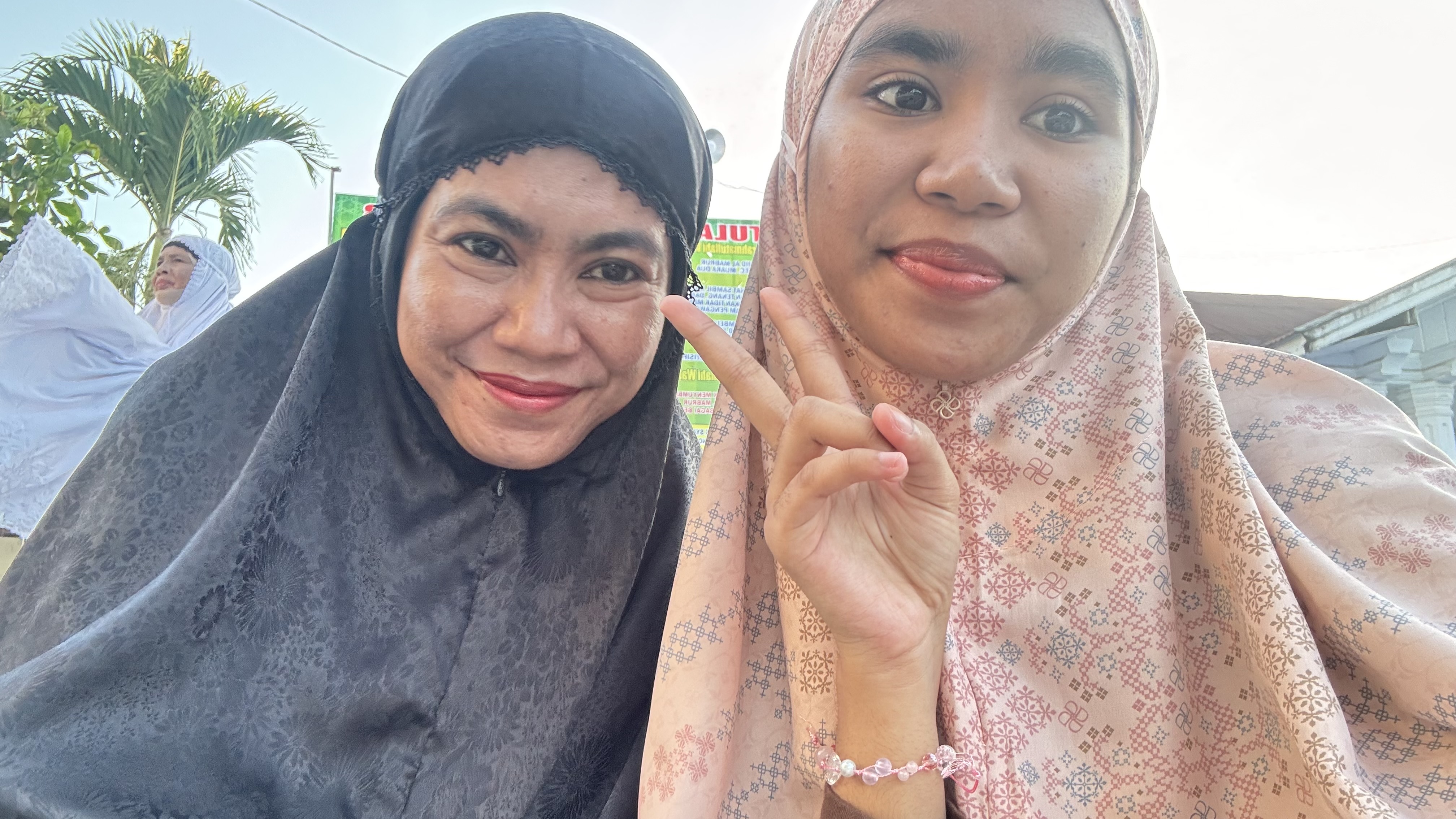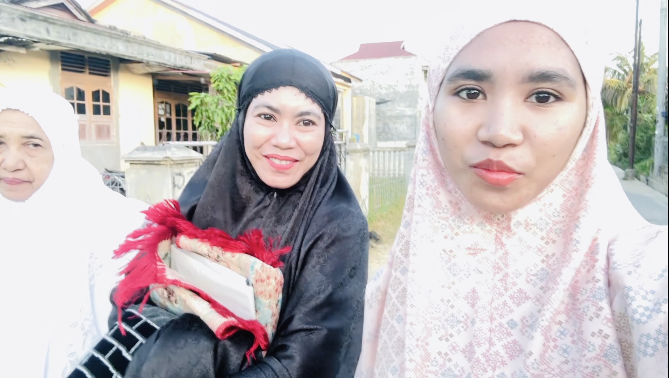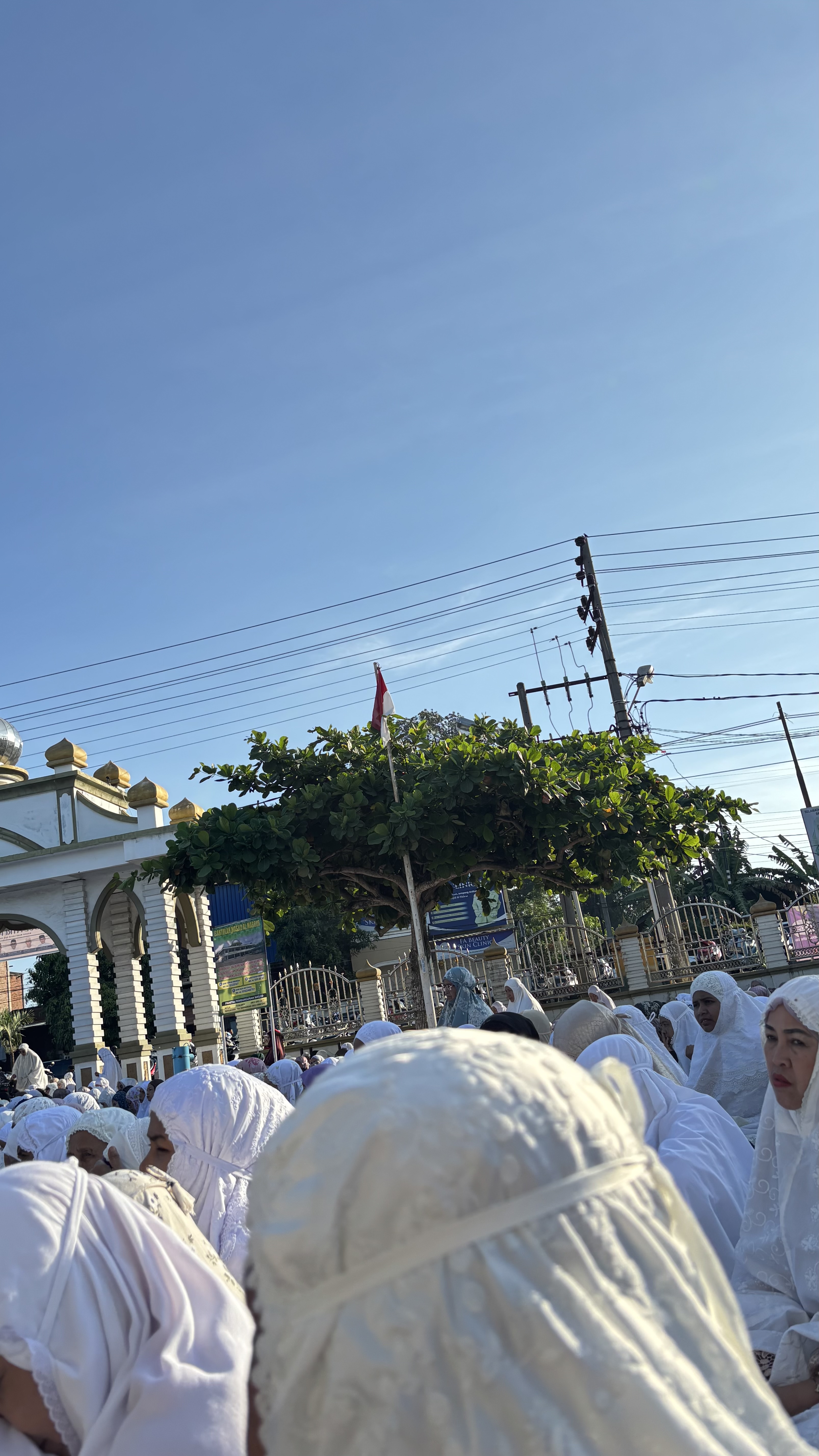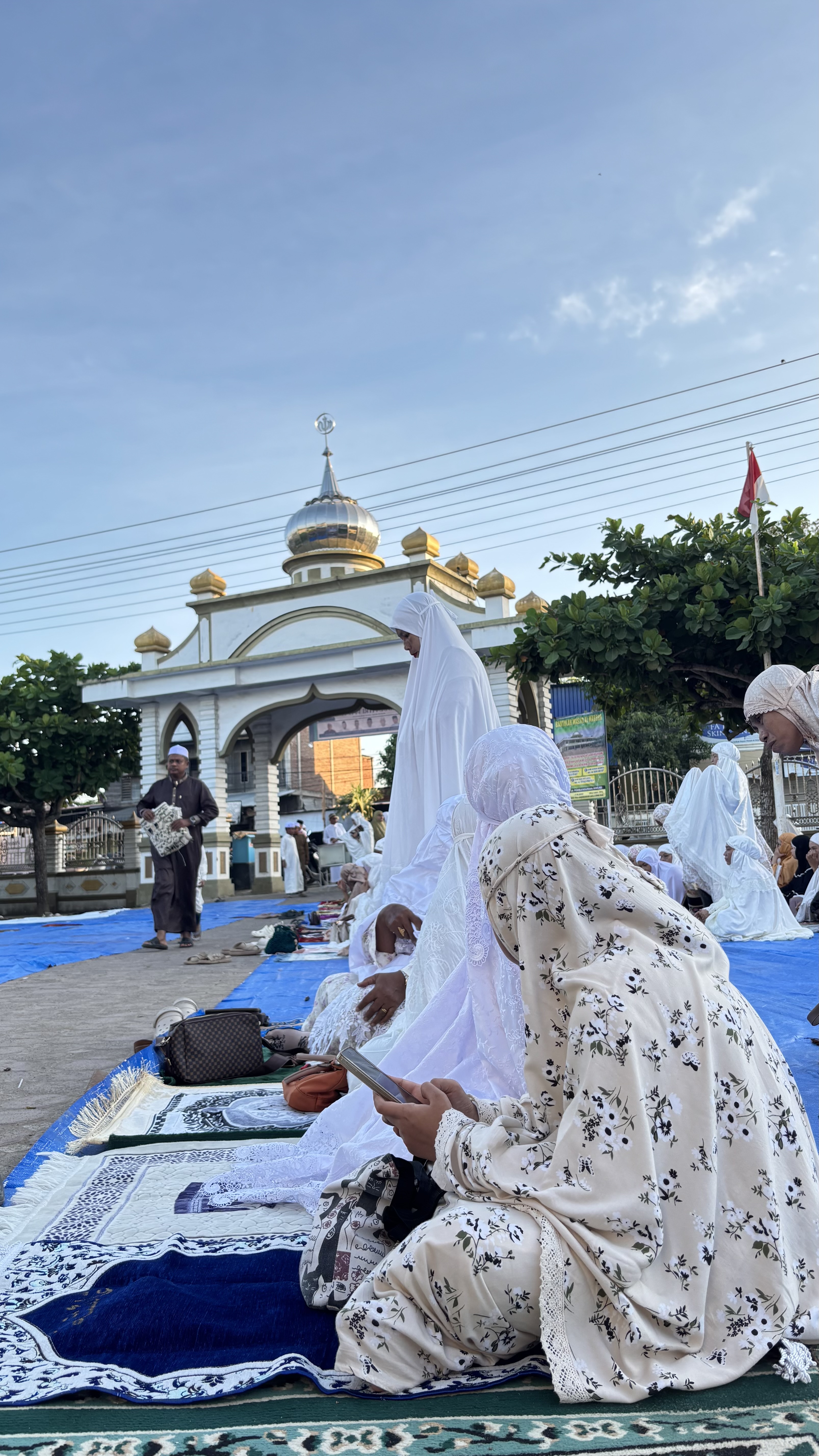 selesai mandi kami menggunakan mukena baru dan berangkat dengam berjalan kaki karena mesjidnya juga terletak hanya 200 m dari rumah kami. Aku berjalan kaki bersama ibunda dan si bungsu.