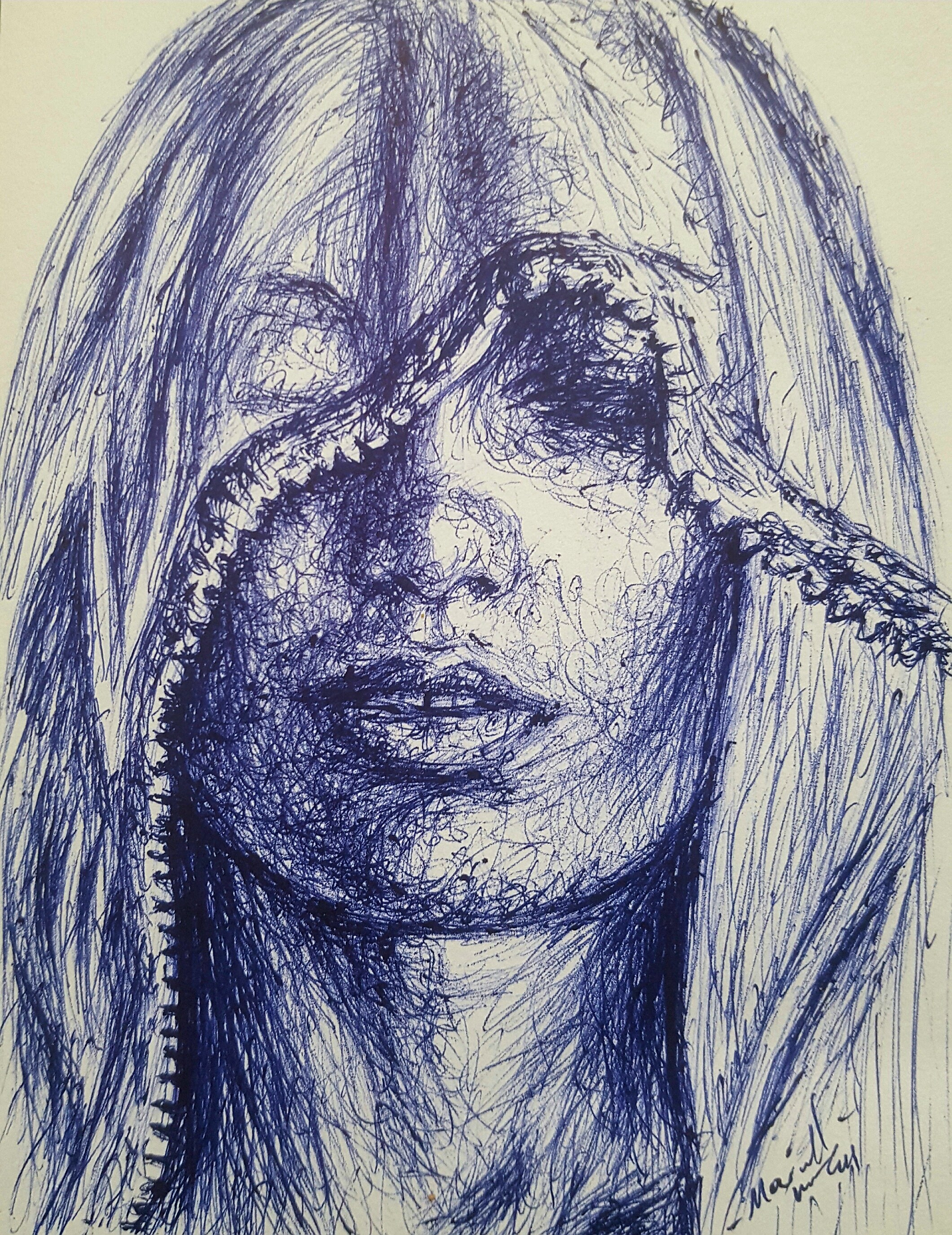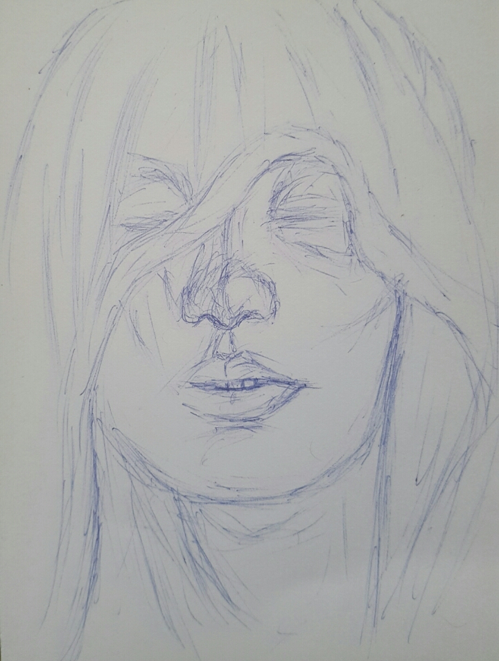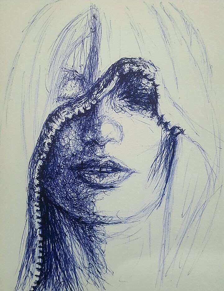 The drawing was done with a blue ballpoint pen on a cardboard paper and I used scribble technique to create this piece. My steps are below: