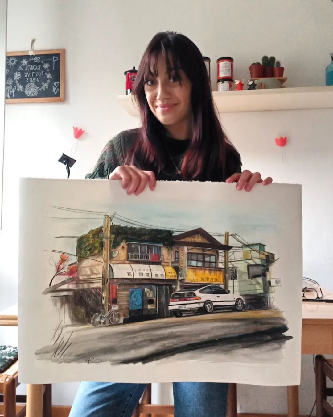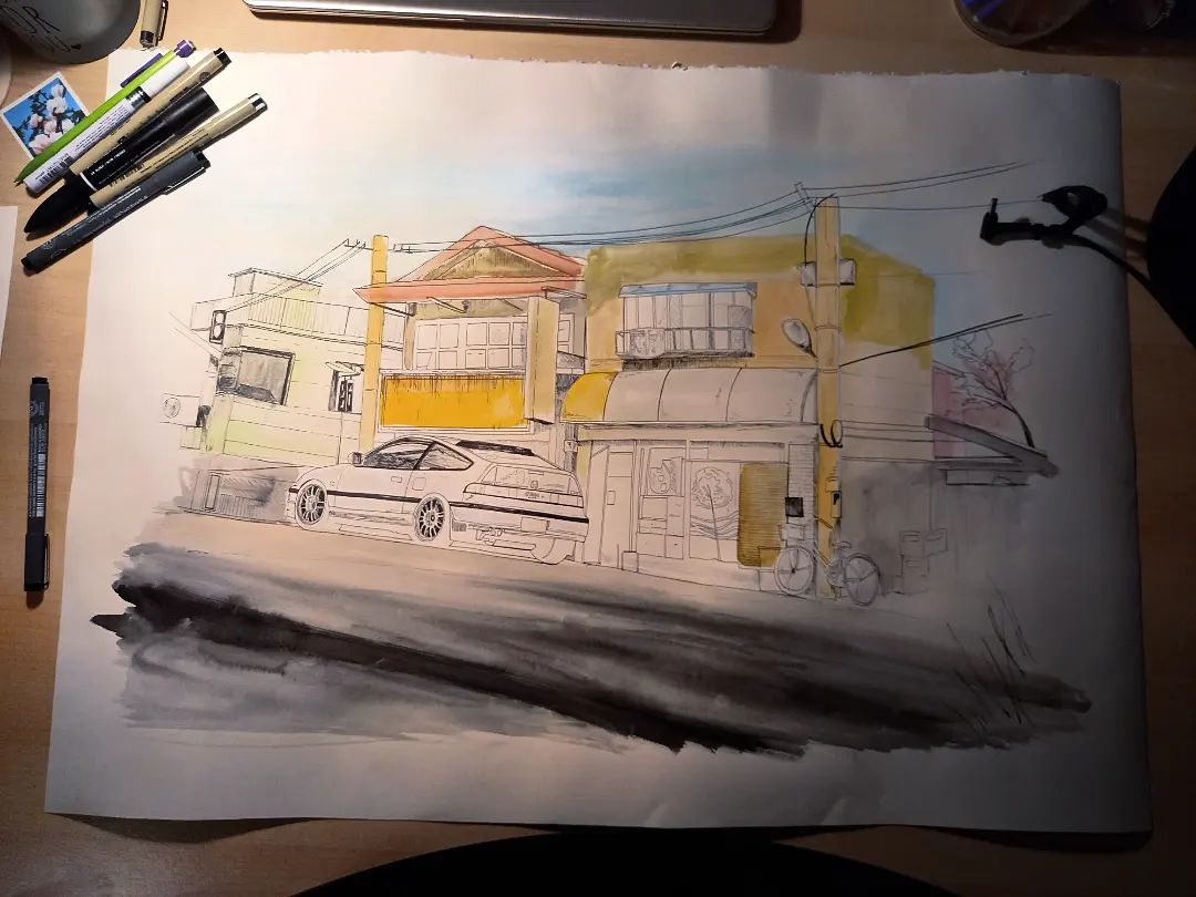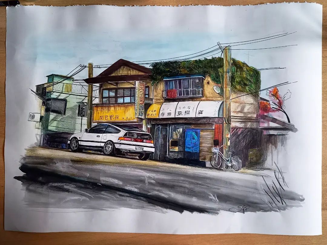 Tutto è partito dalla moglie di un mio carissimo amico che voleva fare un regalo di compleanno a lui in maniera originale e quindi ci siamo confrontate un pomeriggio, per capire cosa rappresentare nel dipinto e lei semplicemente parlandomi del fatto che lui è fissato con la sua vecchia macchina una Honda CRX da lì mi è venuta l'idea di questo.