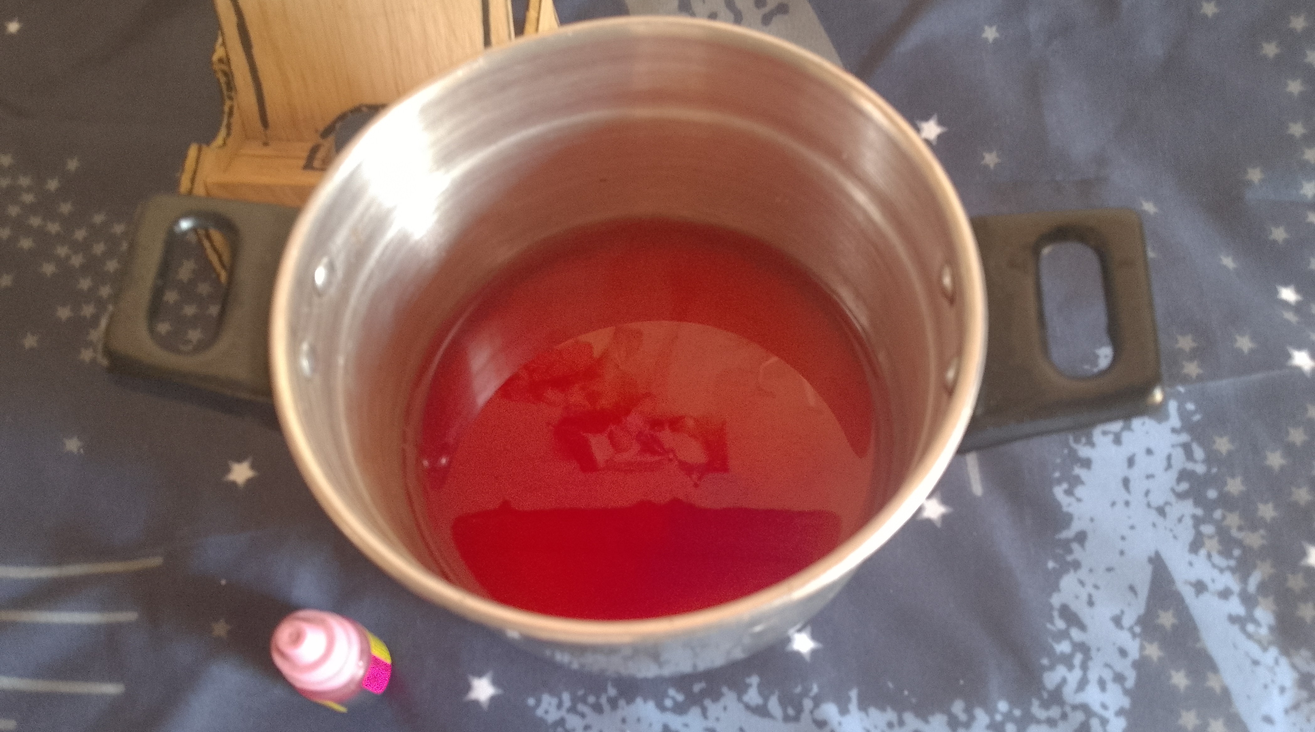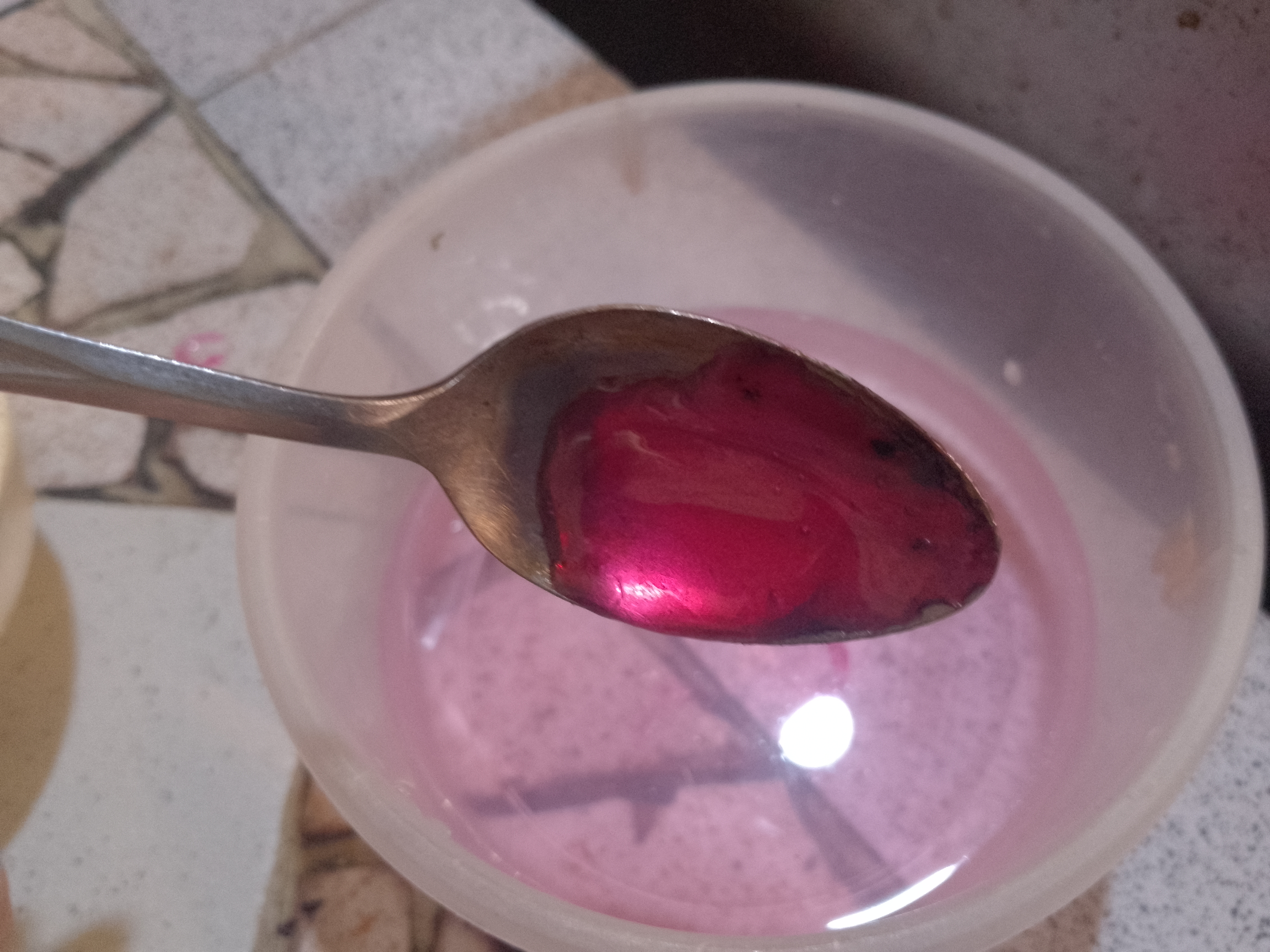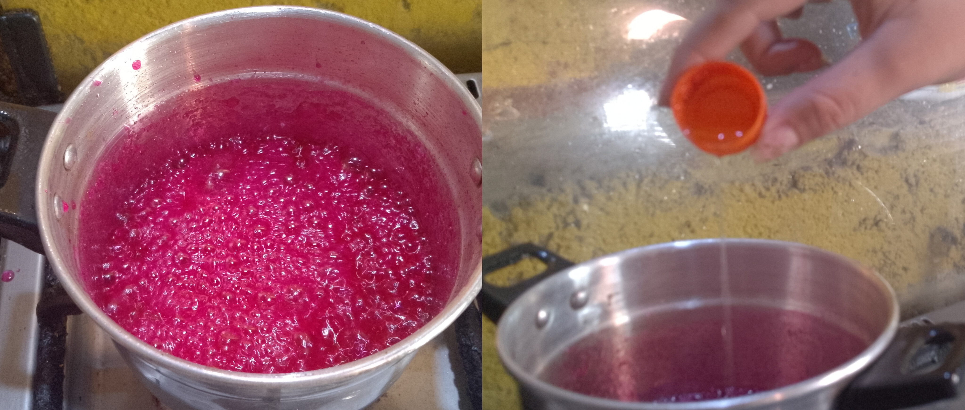 Colocar en una olla el agua y el azúcar a fuego medio, luego agregamos el colorante.