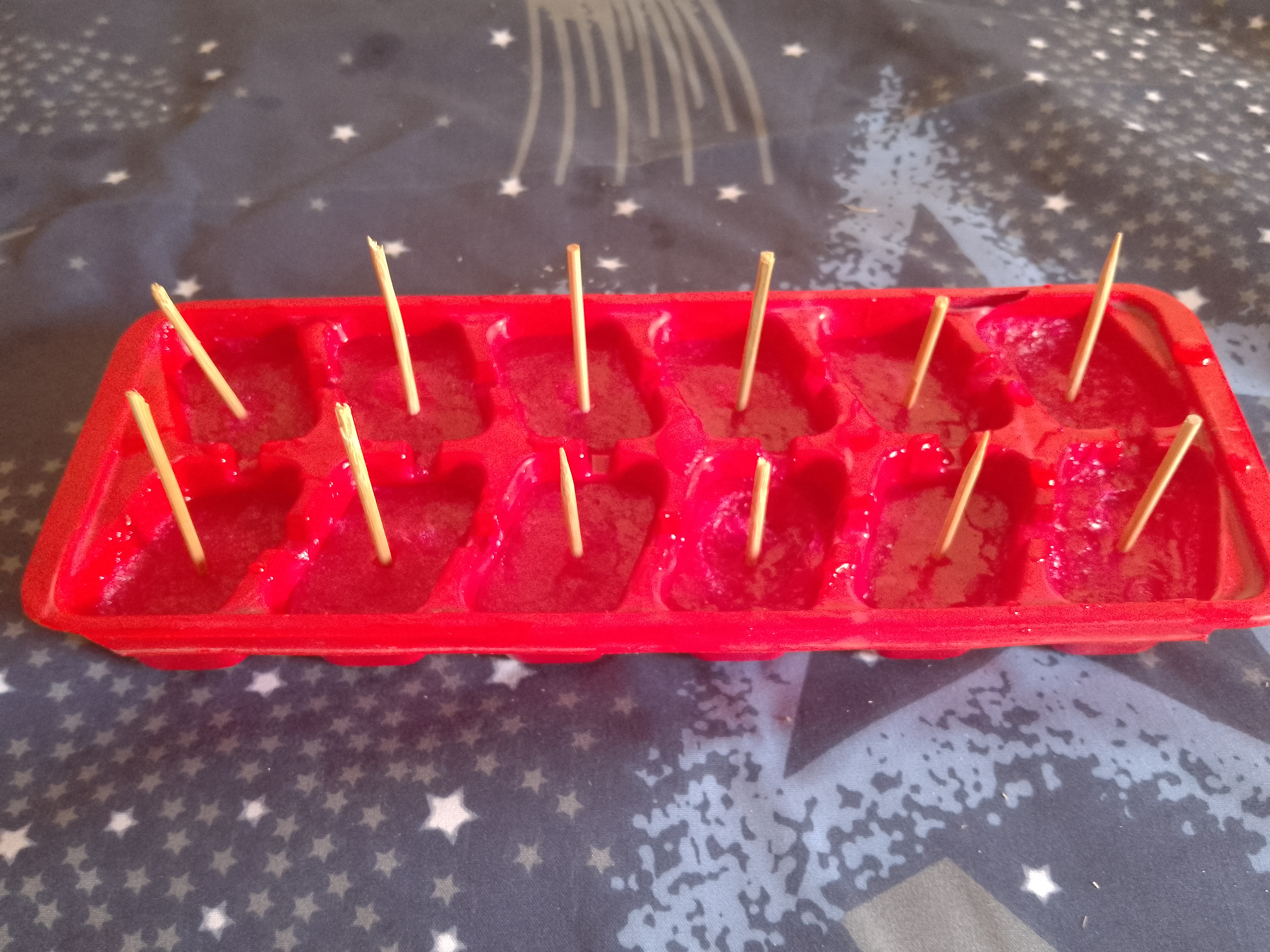 Agarramos un molde previamente engrasado (yo usaré uno para hacer cubitos de hielo) y echamos nuestra mezcla, esperamos a que cuaje un poco y procedemos a meterle los palitos, luego lo llevamos a la nevera hasta que endurezca.
