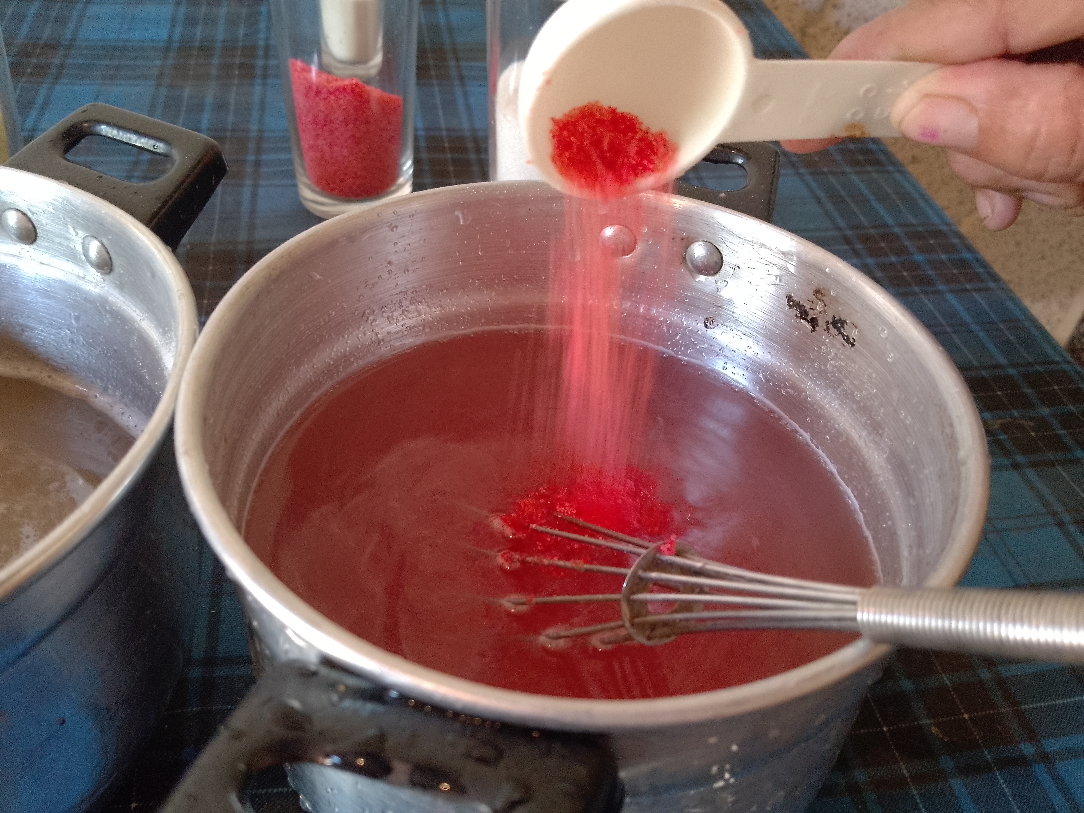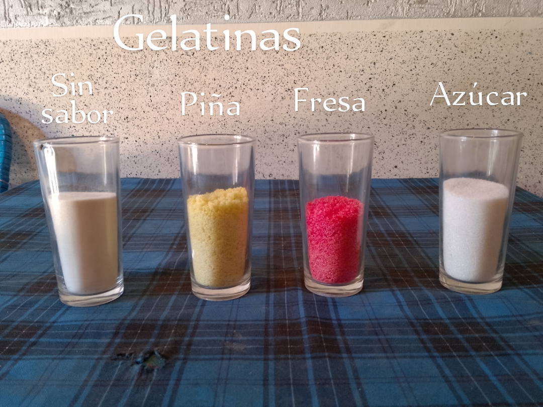 Lo primero que debemos hacer es agarrar 100 gramos de la gelatina sin sabor y disolverla en un litro de agua.Luego le agregamos los 100 gramos de la gelatina de fresa y una vez disuelta le agregamos azúcar al gusto.