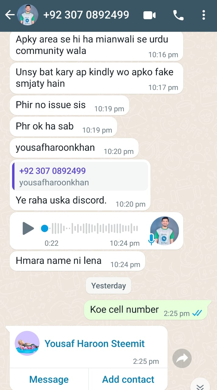 In this screenshot, the admin tells all the secrets to the multi account user that @yousafharoonkhan is the one who is reporting against you. The admin tells the user that yousaf is a resident of your city. You both live in the same region. User asks for his contact number from admin and admin gives his whatapp and discord to multi account user. When multi account user gets contact number, he threatens @yousafharoonkhan and talks about coming to his house and problems arise for our detective .