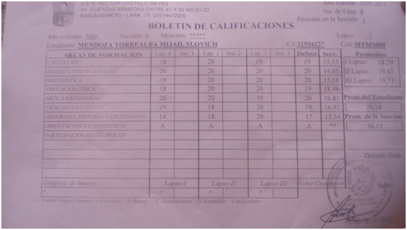 Ya mi hijo culminó sus estudios de este año escolar con éxito. Aquí las notas obtenidas por él.