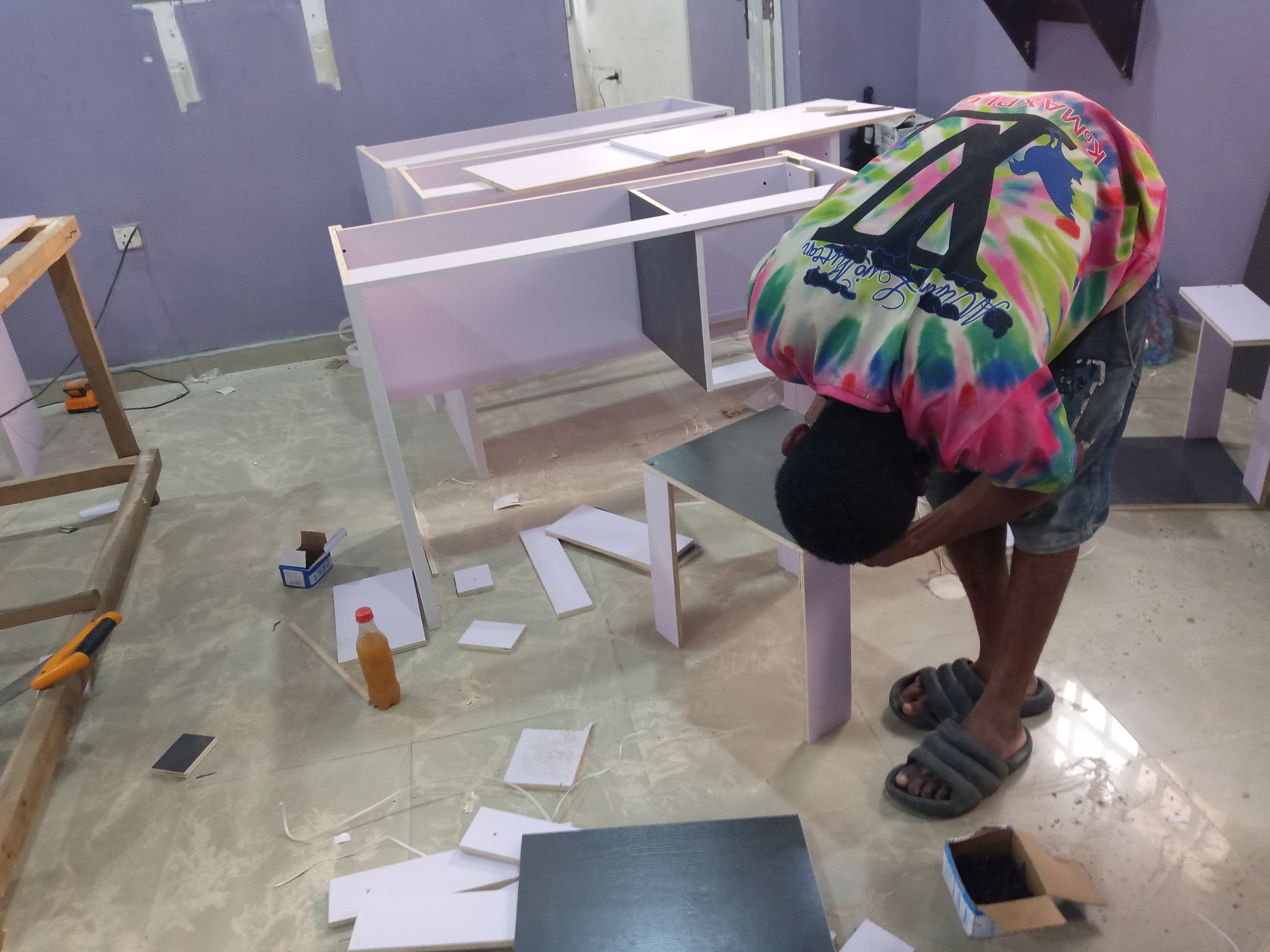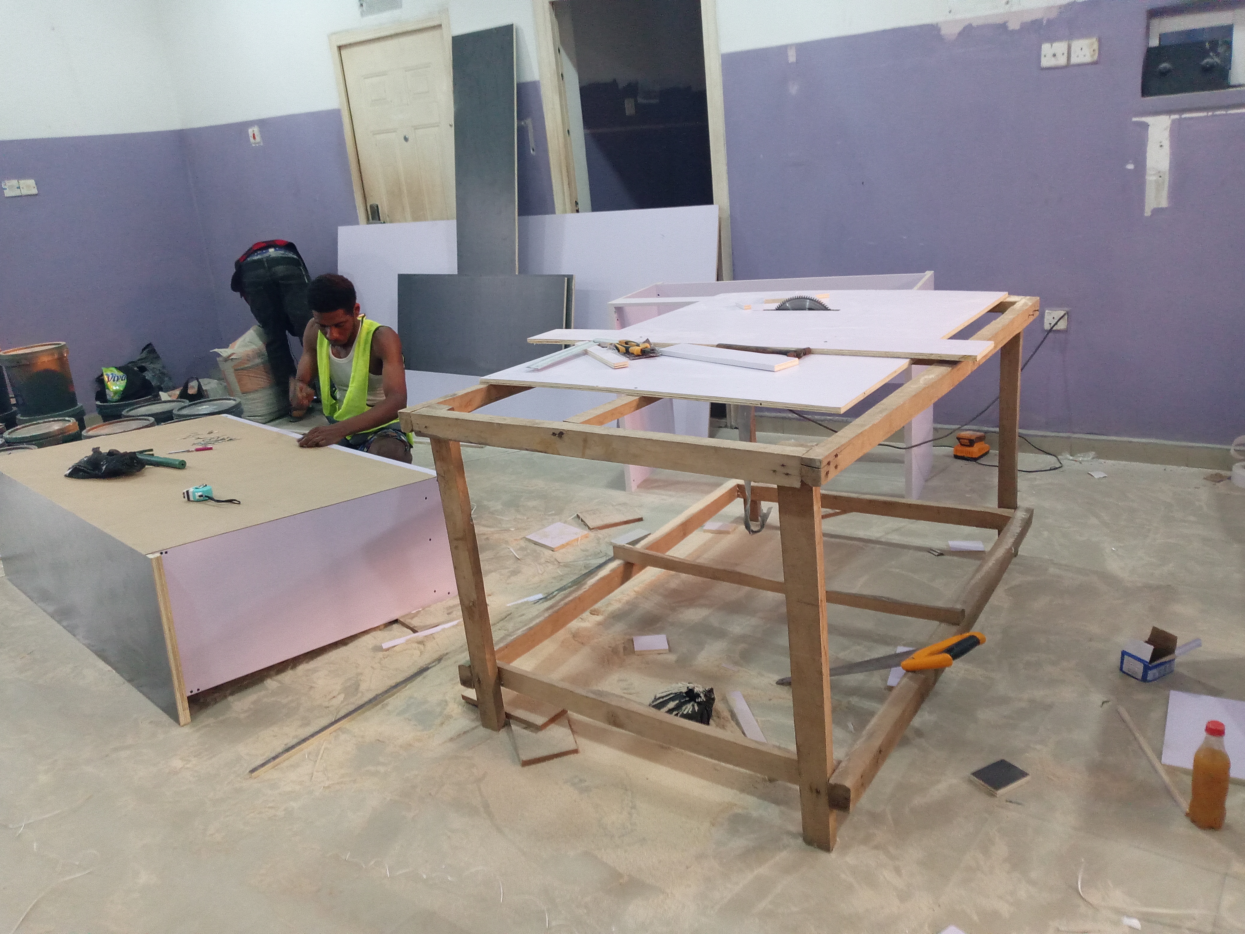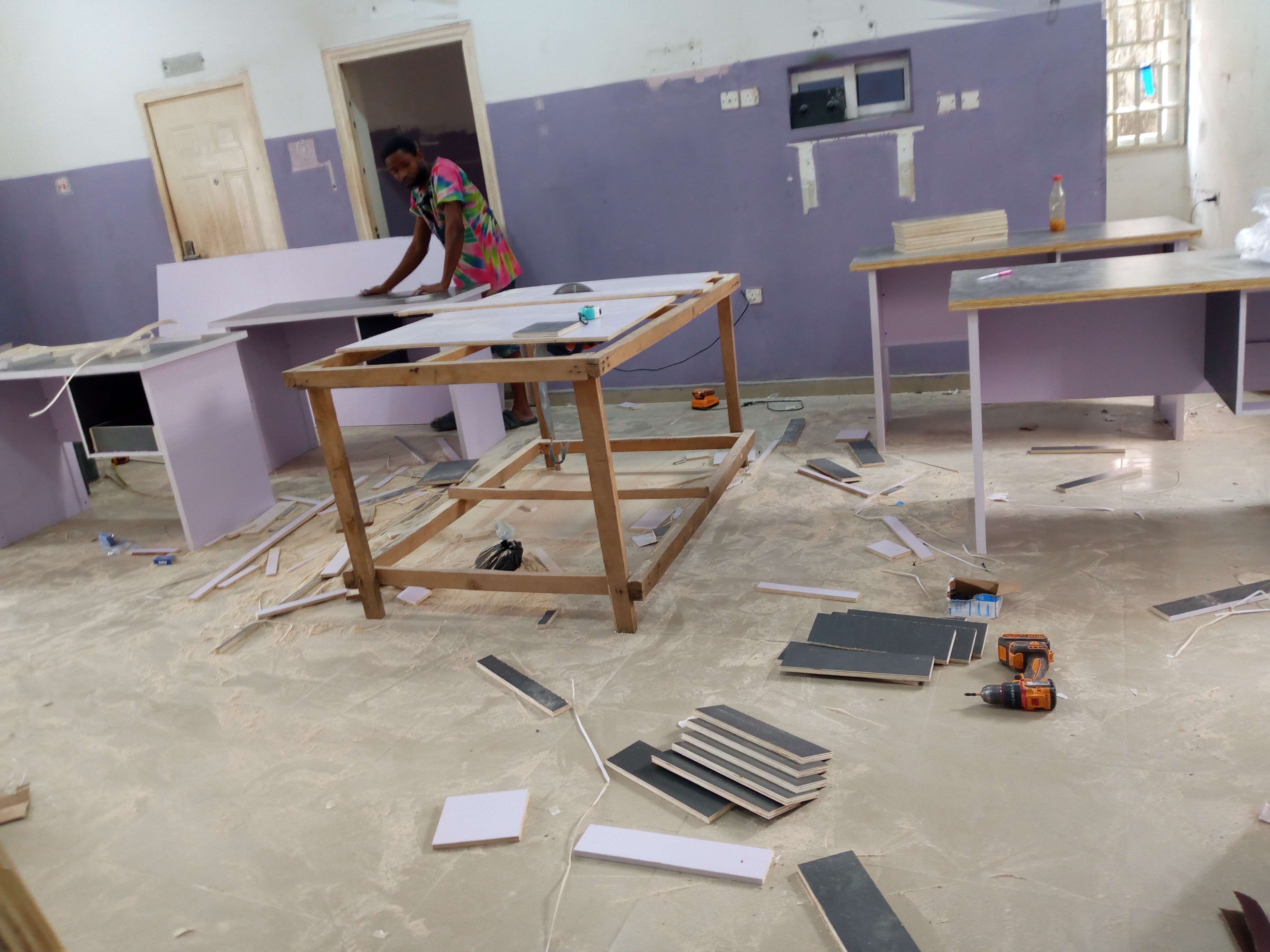 On this day, the furniture guy was on intense working with his team. All the tables, shelves, counters, cupboards and locks was carried out by the furniture team.