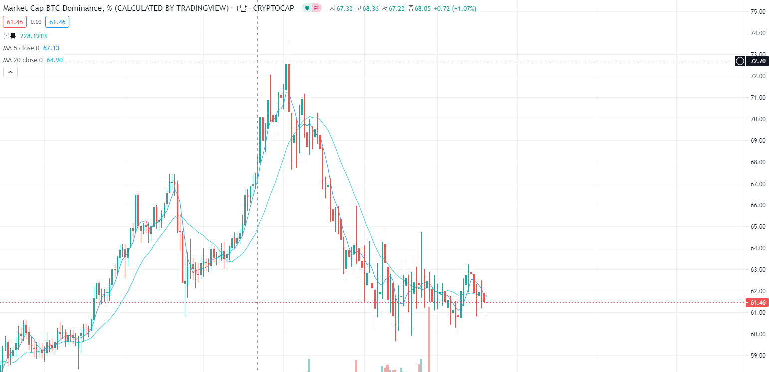 일봉상 다시 61.5정도로 도미넌스가 수렴하려는 모습을 보이고 있습니다.