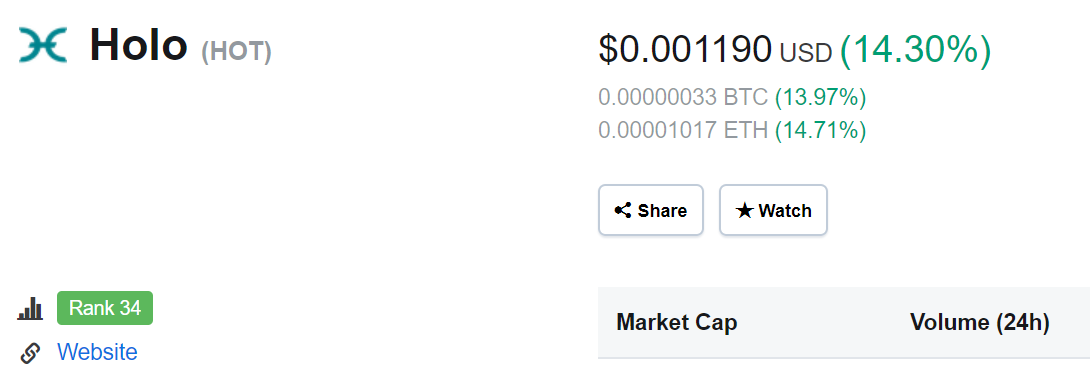 Holochain (HOT) is currently trade at US$0.001190, reaches its three-month-high. What's more, the coin also reaches their own highest ranking in the crypto market in 34th position.