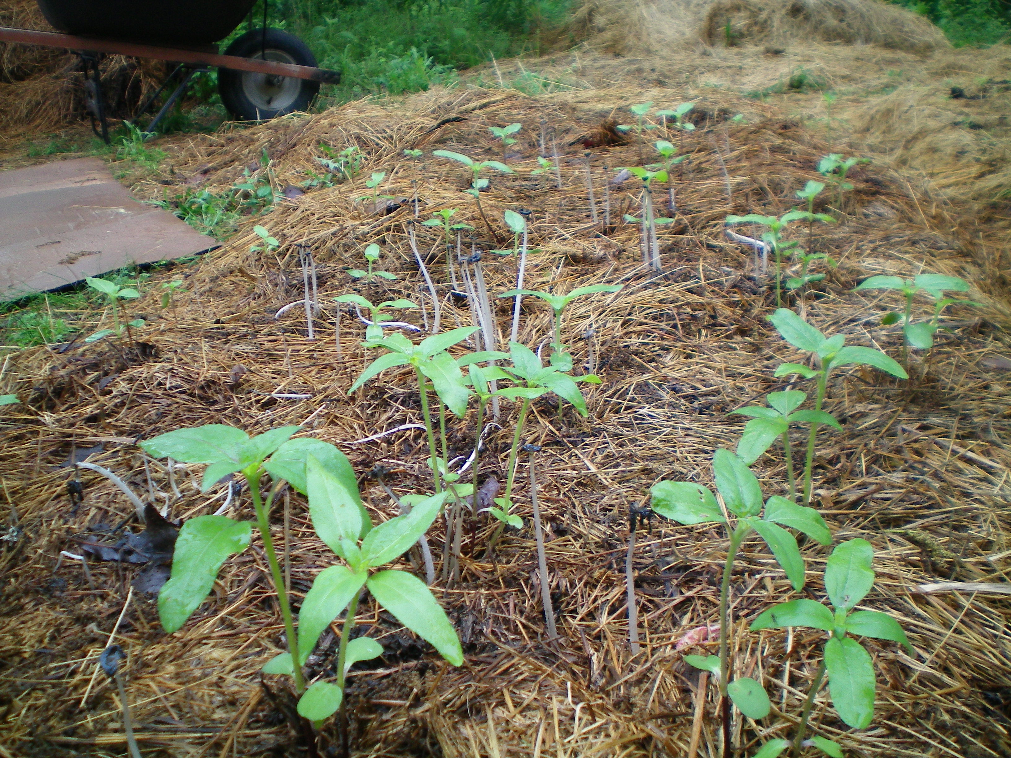 One of the first things I planted this spring were sunflowers I had started indoors at the beginning of April. Here they were on May 4th with mushrooms growing next to them that were just as tall.