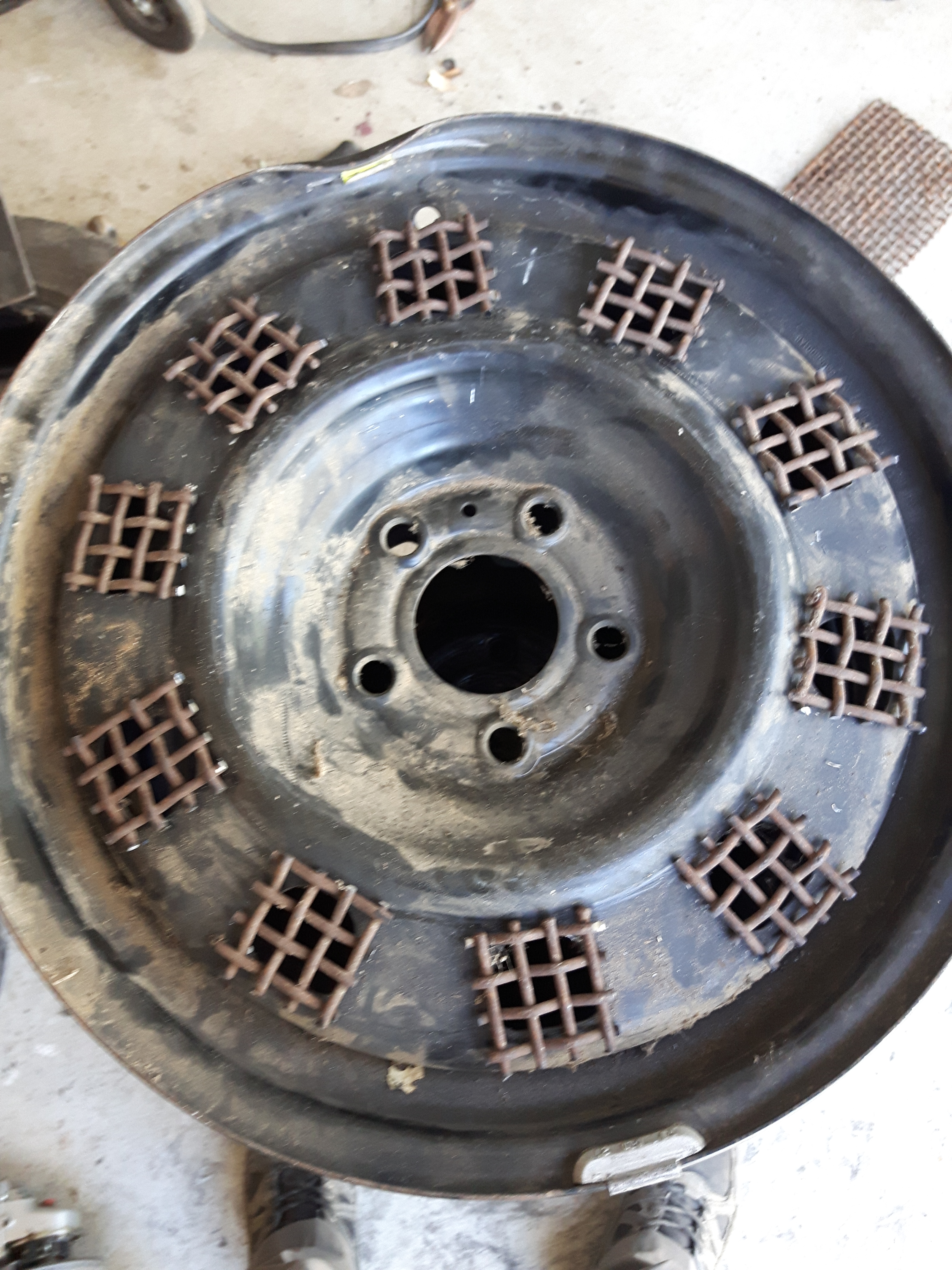 While at it, I ground clean the interior section of the wheel that would be plugged as well. I wanted the small squares on the exterior of the rim as it would be easier to weld them all. It would have been hard to get them all welded up in the interior. The center section was a different story and could be welded up inside.