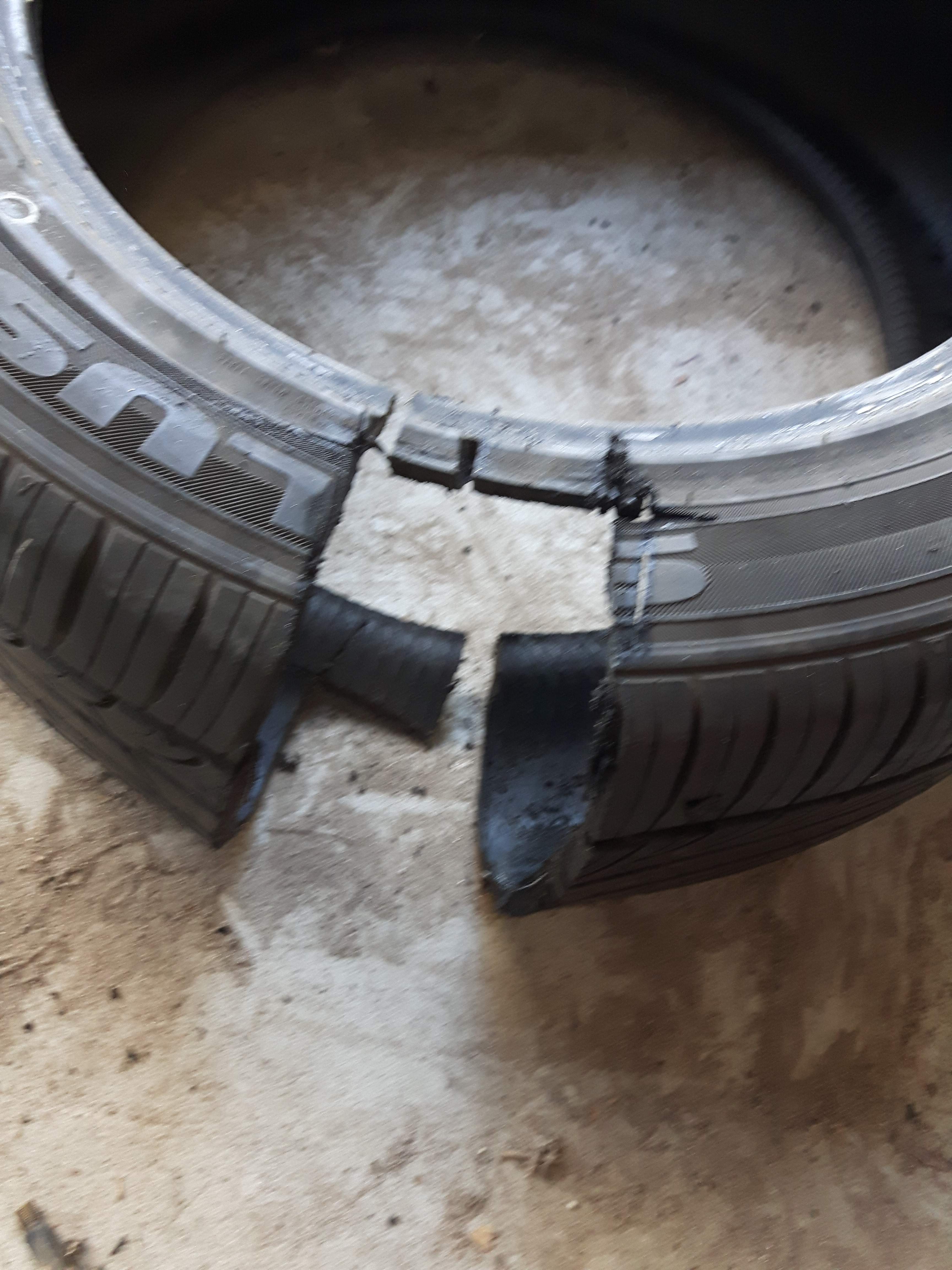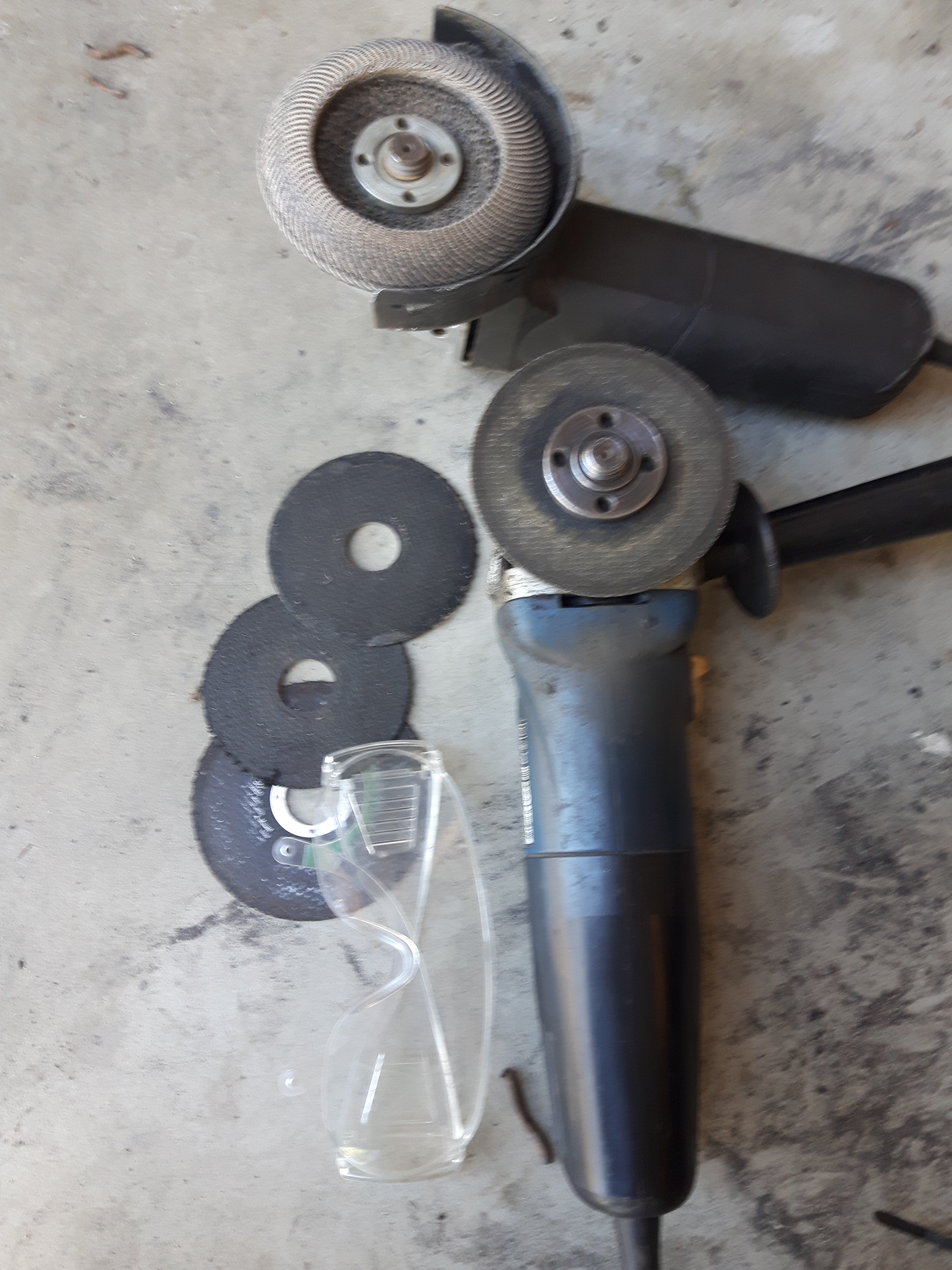 Getting the full tire off was a pain in itself. I had to cut a large portion of the tire out so that the angle grinder could fit in the center so that I could cut the interior "glued" section. When using an angle grinder always wear eye protection as well as gloves (not pictured). I have a spare angle grinder with a flap disk on it to save time. The flap disk was used to grind metal so that it was clean to weld. Cutting through the tire wore out my cutting disks to no end! I was burning through them faster than if I was cutting metal.