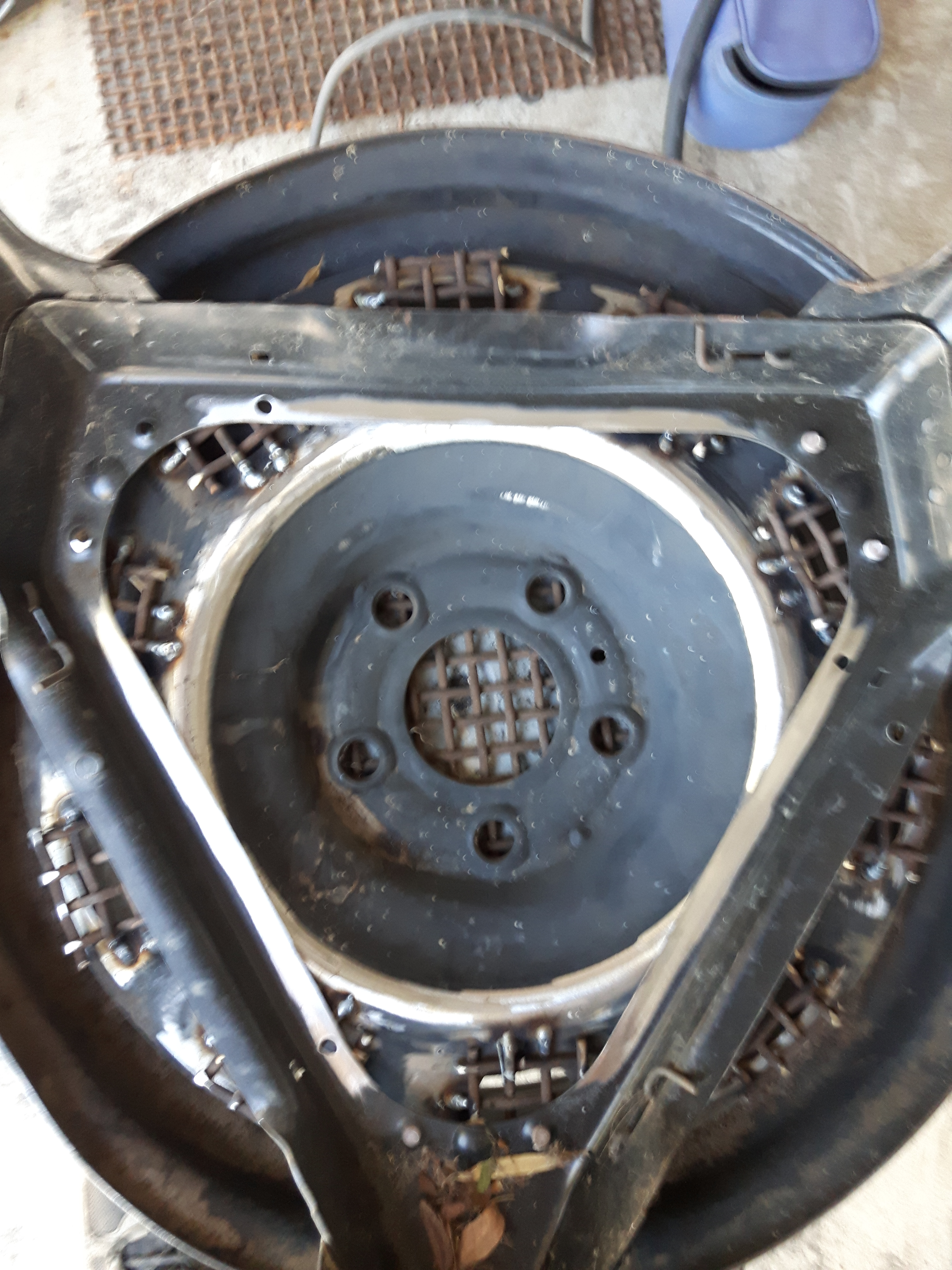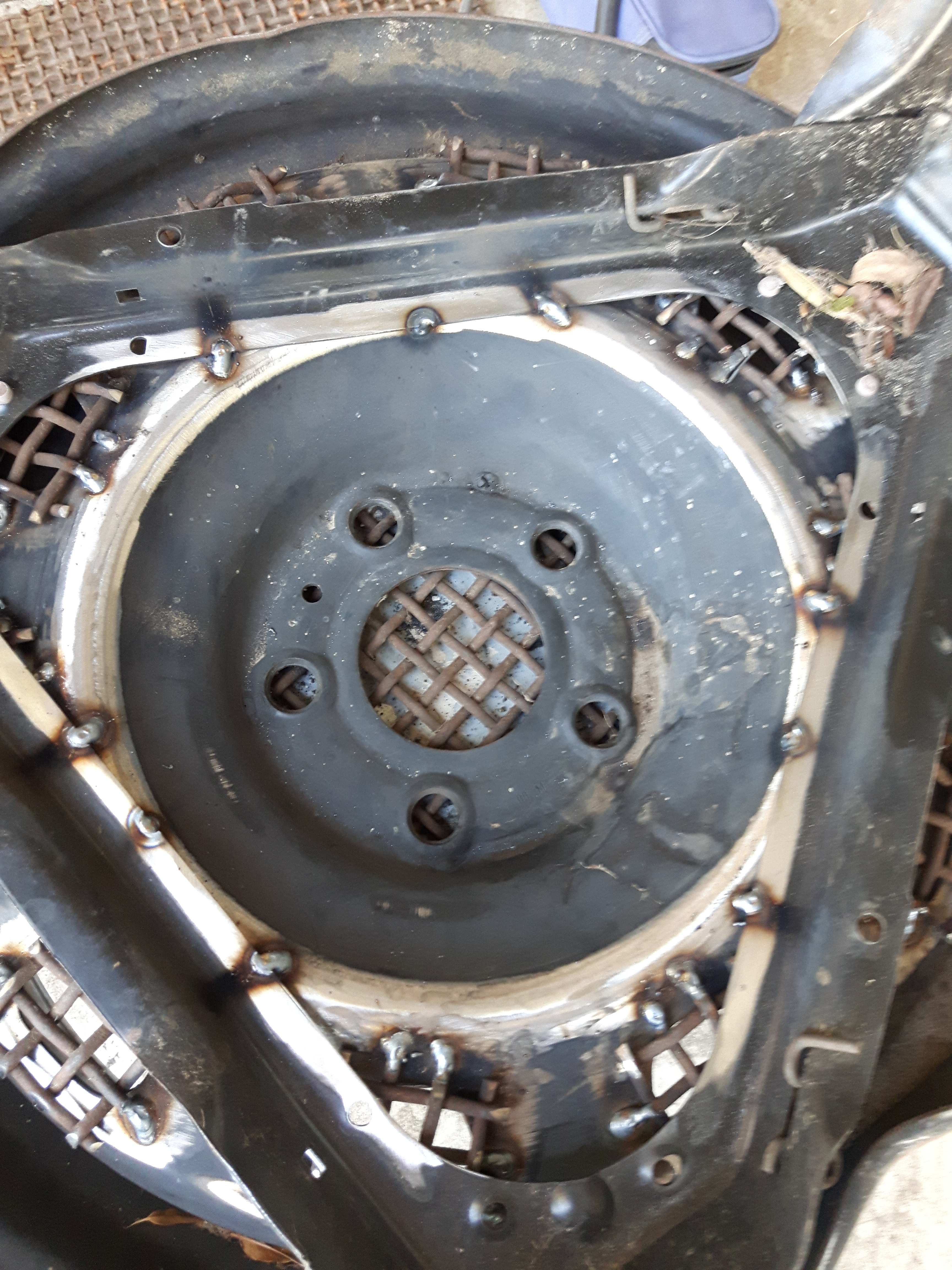 I cut the best circle I could from the grating to cover the center section and while the rim was flipped I figured I would weld it into place. I fired up the good ole welder and had at it. Gloves and welding mask are a must!