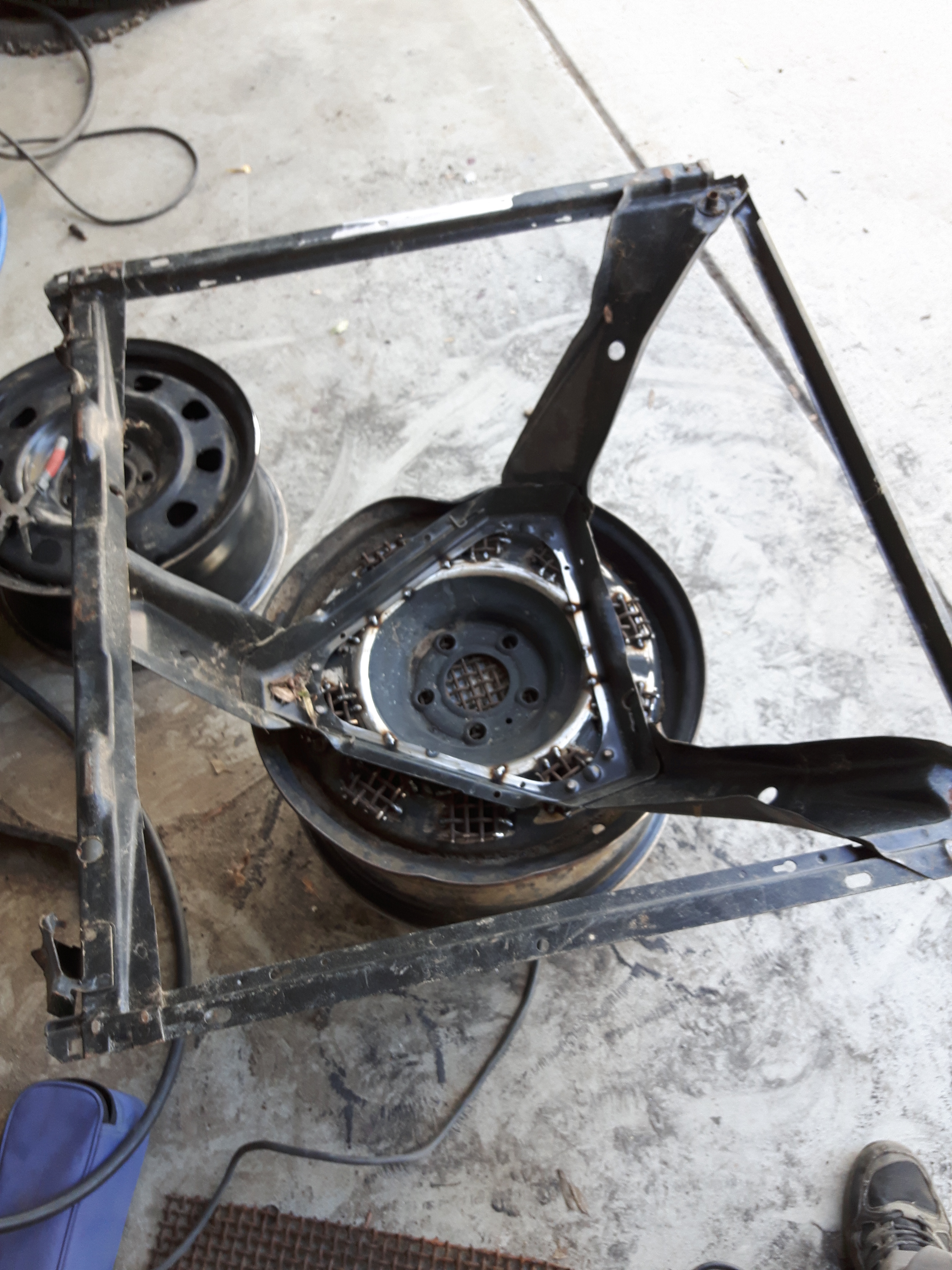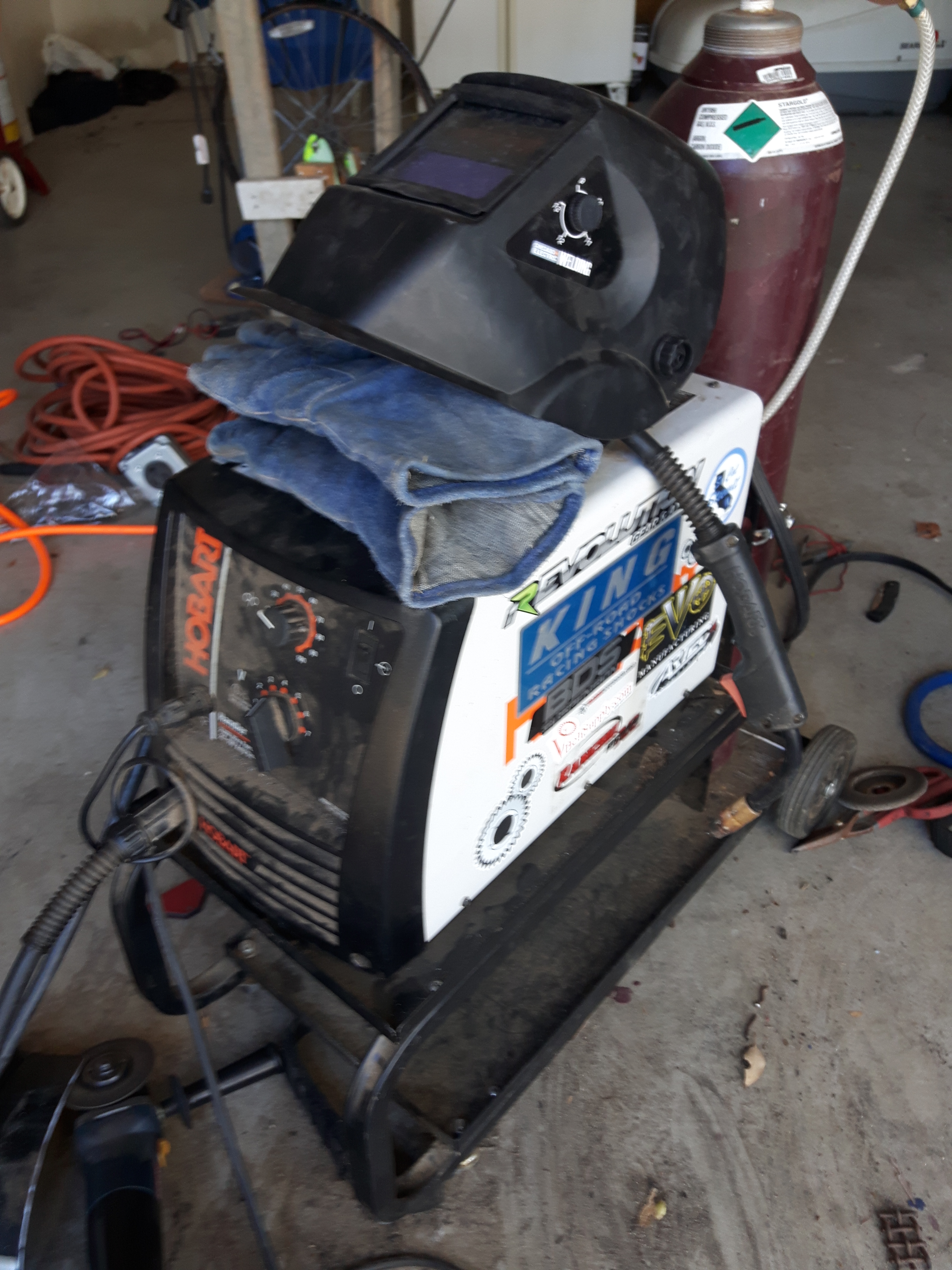 At this point the stand could be welded on. Like the wheels, the stand was taken from an old washing machine and saved. I stripped the topload washing machine of a ton of parts and decided the stand looked useful. I ground clean where I was going to weld.