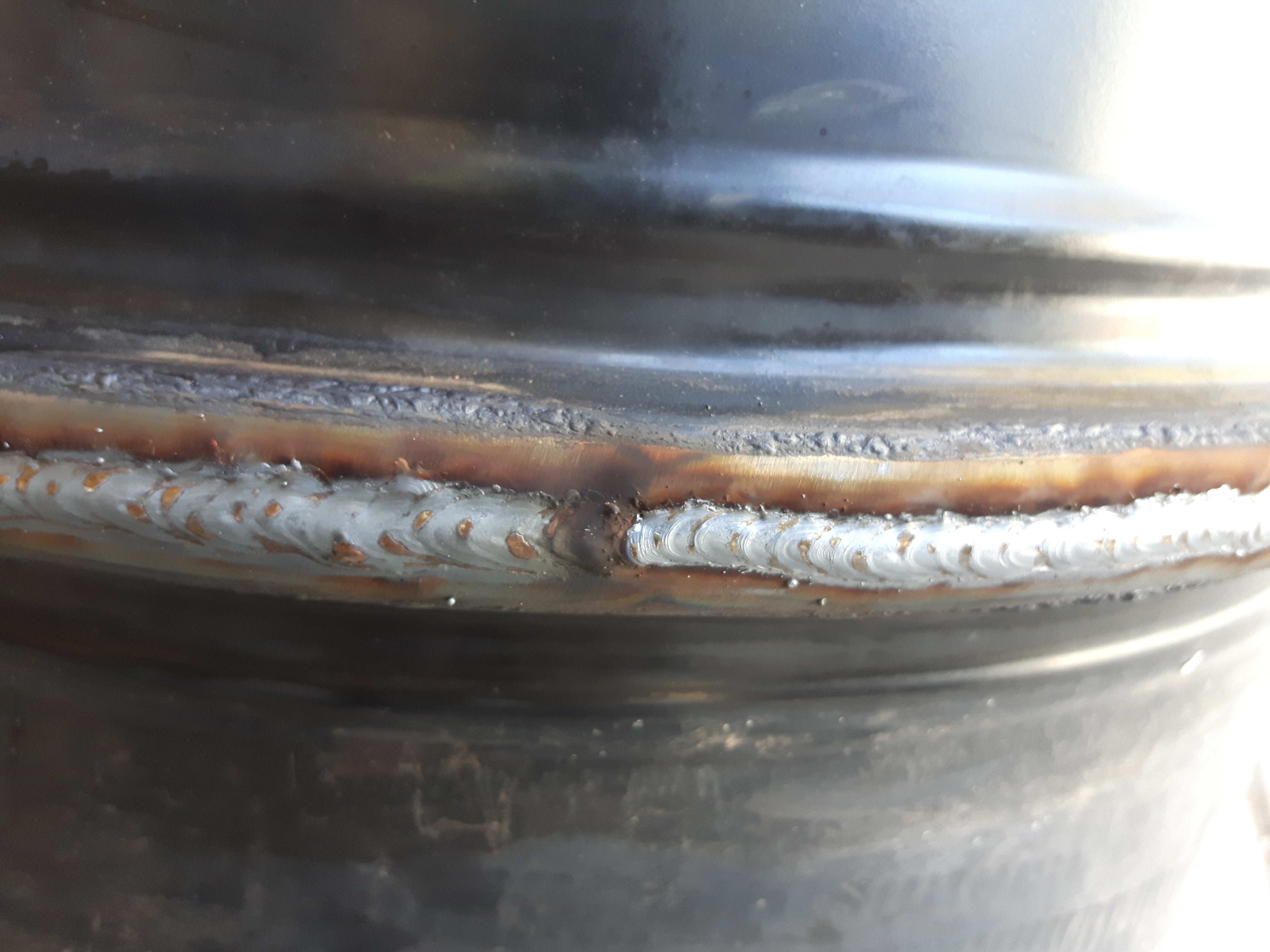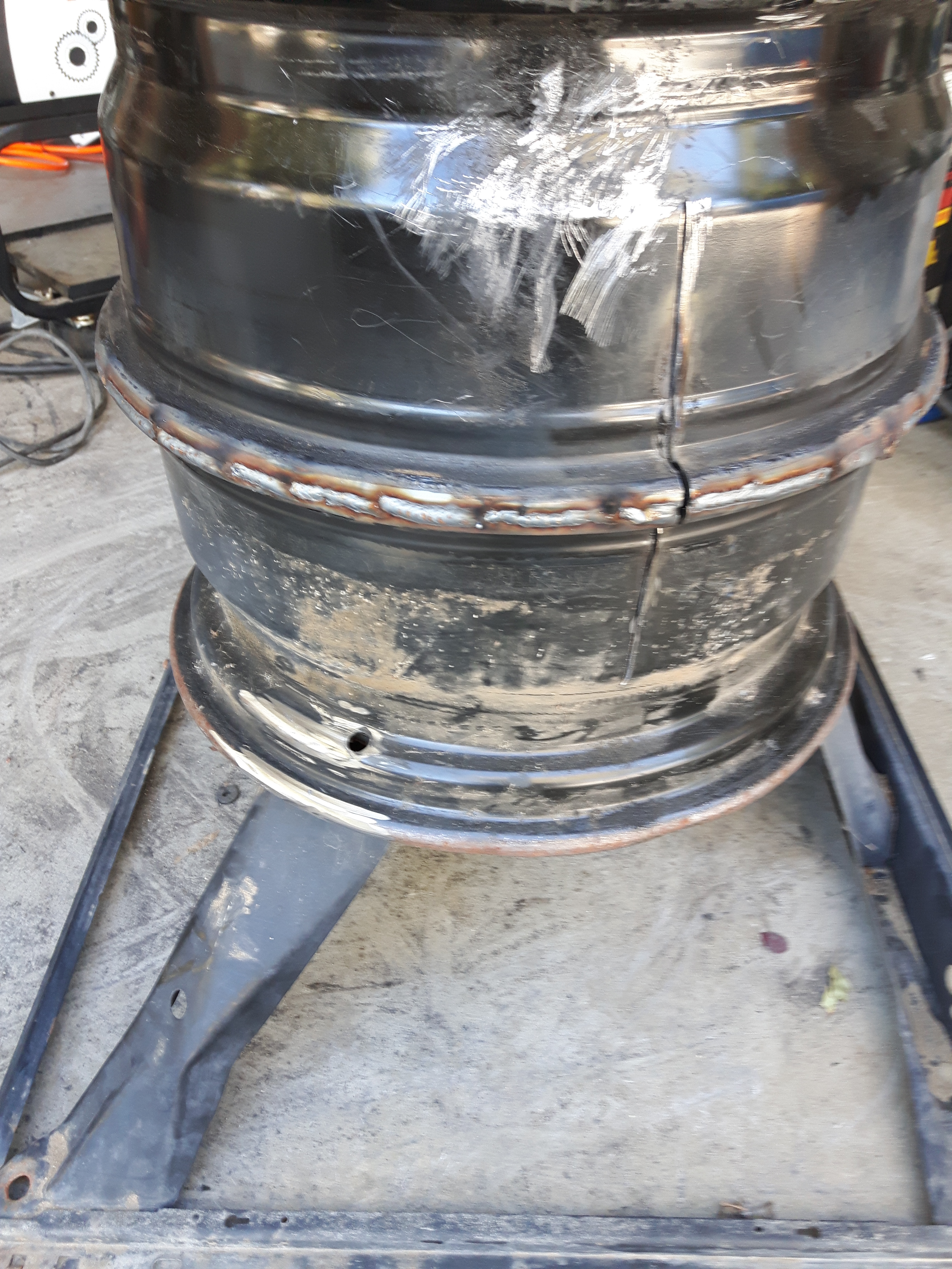 I welded the two wheels together, producing four inch beads at a time. This prevented the steel from warping. I alternated to the opposite side between welds.