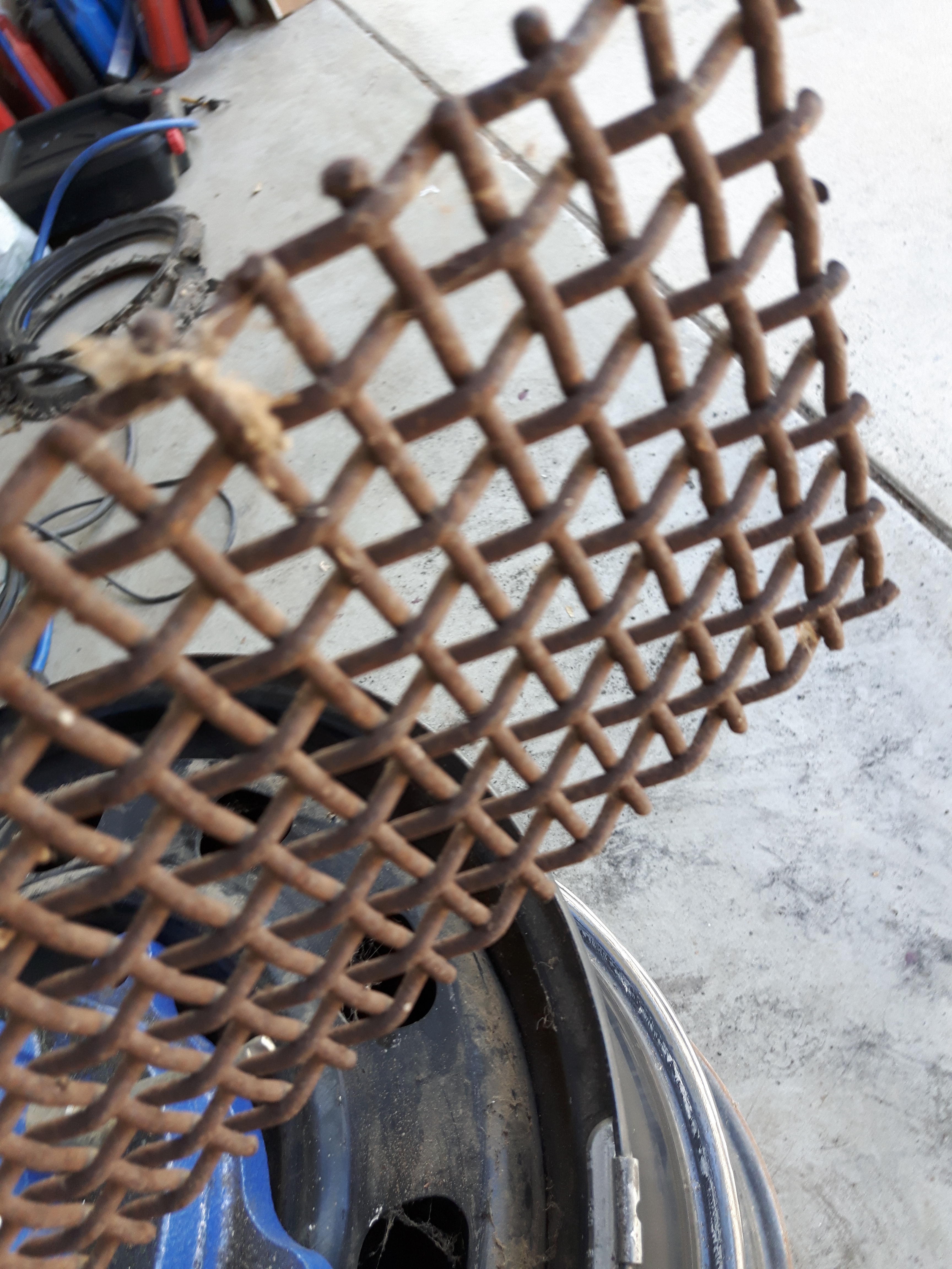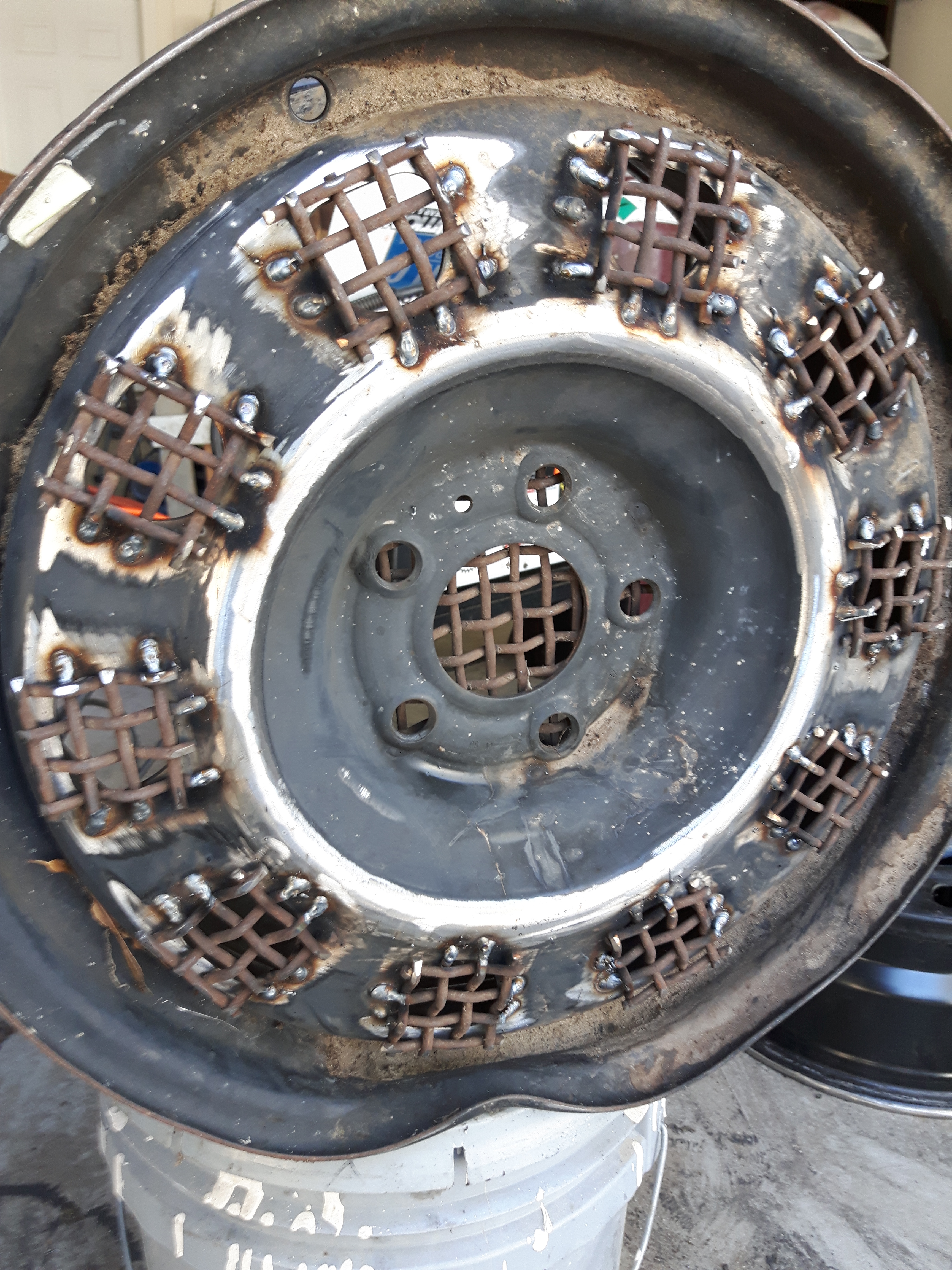 The steel grating could only really be tack welded as it would melt very fast once the weld bead hit it. I flipped the rim back over and welded up the small squares.