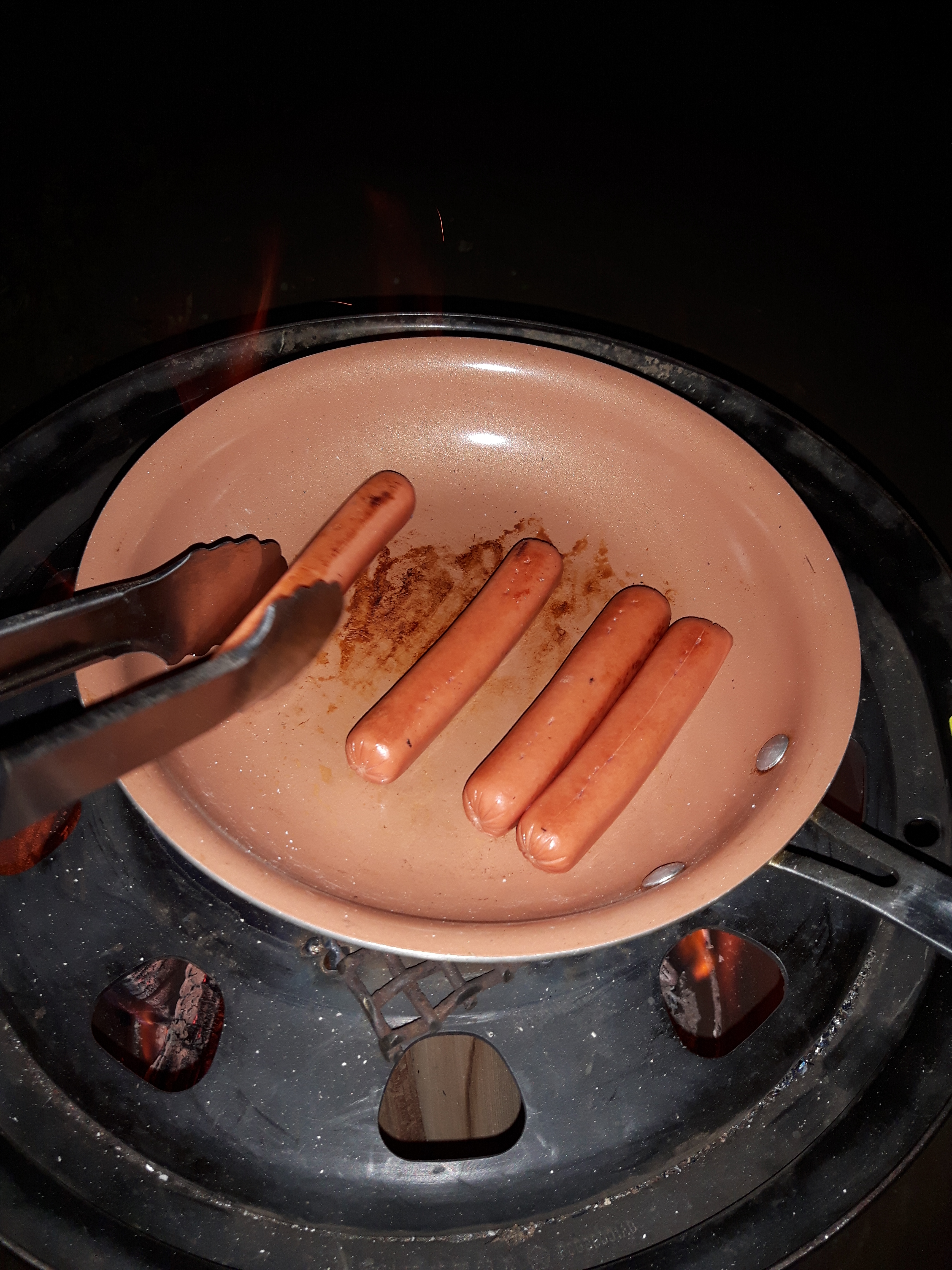 I ended up starting to construct the door but did not weld it on. I got a little excited about it being near finished that time flew by and that evening I wanted to use the stove. I might get around to finishing the door and painting it but for now it seems to work fine as is. Becca and I decided to cook something easy like hot dogs. I got the fire started and cooked the dogs up.