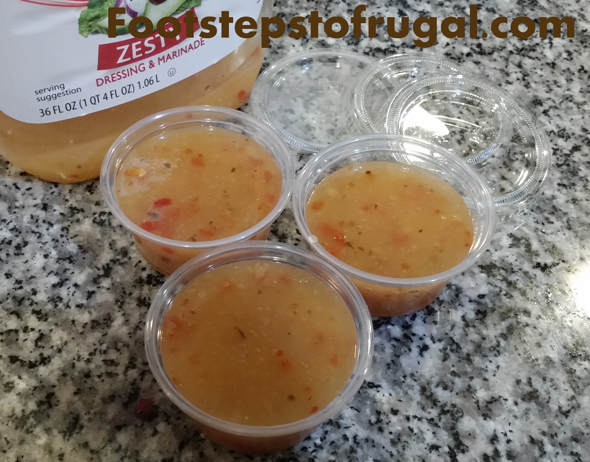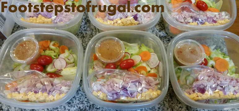 Last, but not least, is dressing. While I personally don't care if my salad has dressing, my family likes the added flavor. Disposable plastic snack cups are perfect for dressing portions. If you are like me, even though they are disposable, I frequently wash and reuse them But, if time is at a premium, at least they are recyclable. I won't generally try to use different dressings in each salad in a week, but I will try to change up dressings from week to week.