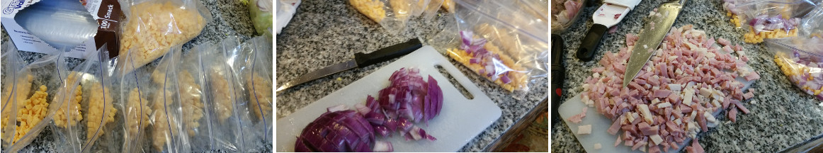 Once all of the vegetables are assembled, it's time to get creative. For this round of salads, I decided on meat, cheese and onions. Other times I have done crunchy bacon bits and shredded cheese in one baggie and meat and onions in a separate baggie. Dry fixins' and wet fixins' should go in separate bags. Chopped onions will make bacon crunchies or croutons soggy. Cheese can usually go either way, so this round I just did one fixins' baggie. The sky's the limit on what you can add. At times I have used Avocado slices, sliced almonds, roasted soybeans, crunchy tortilla strips, croutons, crumbled feta, chick peas, roasted pumpkin seeds, hard boiled eggs, or sunflower seeds.