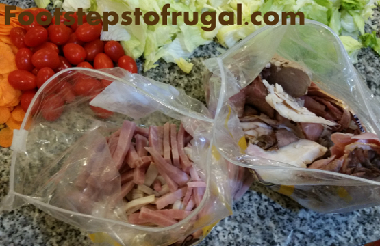 Next we consider the protein. There are many vegan or vegetarian options for proteins and if that is what your family likes, then great, but my family wants meat. While any meat (or non-meat) your family likes is fair game, leftovers can work great for this. I have used small strips of steak, roasted chicken and even seafood. However, I have found that one of the most economical solutions for a variety of meats is deli ends. A little known secret is that if you go to your deli guy and ask, many times they have deli scraps and ends that they will sell you cheap. There are usually chunks of turkey, roast beef, ham, salami, etc. Sure, fresh is better, but deli ends are an economical way to add protein to a salad and probably give them variety that they didn't already see the night before at dinner.