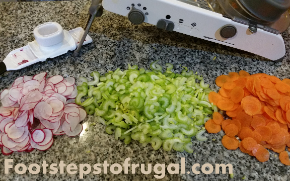 I start by choosing the vegetables that I want to use. This week I was able to get good quality celery, radishes, carrots and grape tomatoes at a reasonable price. The vegetables I use vary by season, but I always try to add at least 3 different vegetables to keep it interesting. Yes, I know tomatoes are a fruit, just play along. Use the freshest vegetable possible because these will be in the refrigerator for a couple days and nothing spoils a salad experience like a mushy brown vegetable.