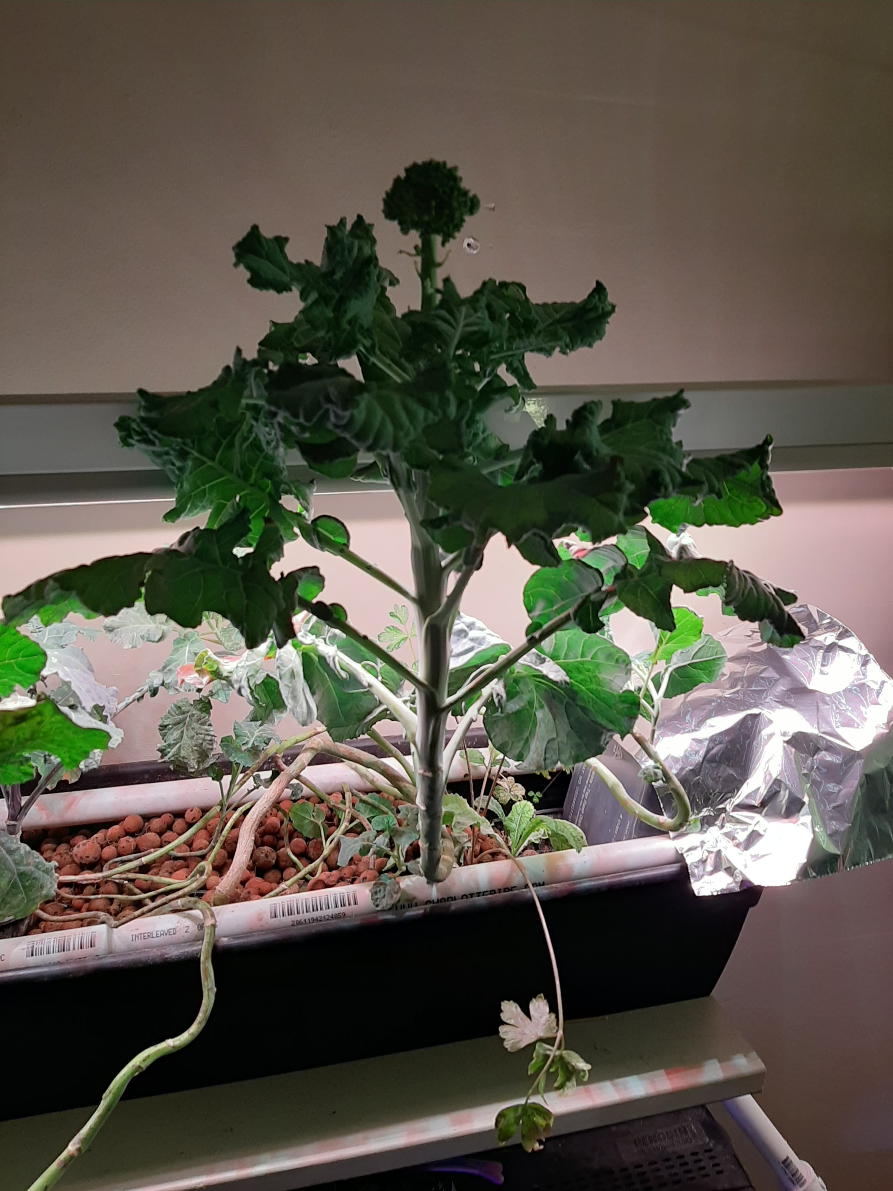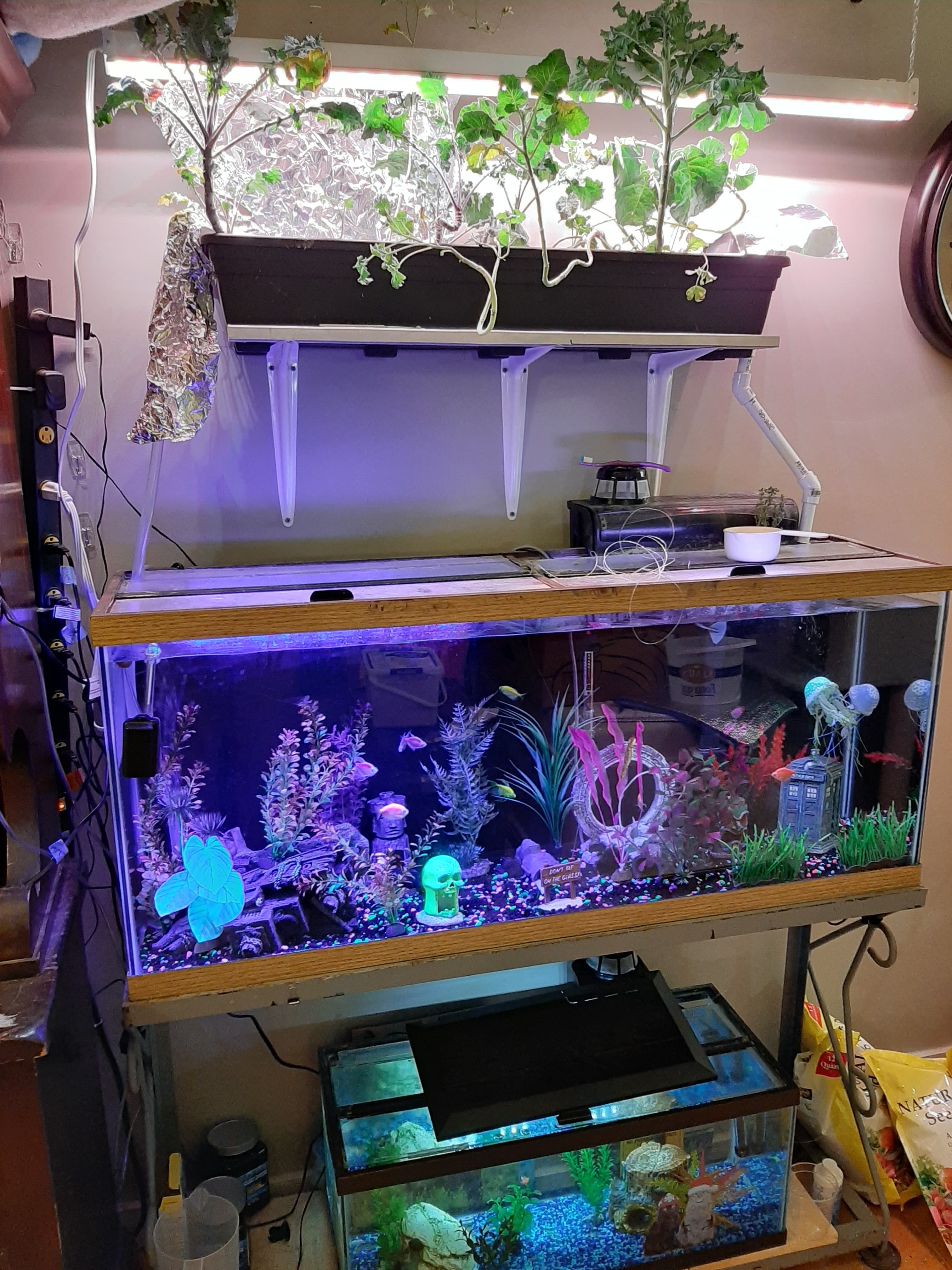 I have a aquaponics setup using my large GlowFish 55gal tank. I normally grow salad plants with it but this time I tried broccoli. Though it is small and some changes need to be made with lighting and spacing, it still worked great in my opinion. Below are pics of my fish tank and plant setup. This is a hobby setup and not expecting it to sustain us. It is a lot of fun though and a great teaching tool for everyone 🙂