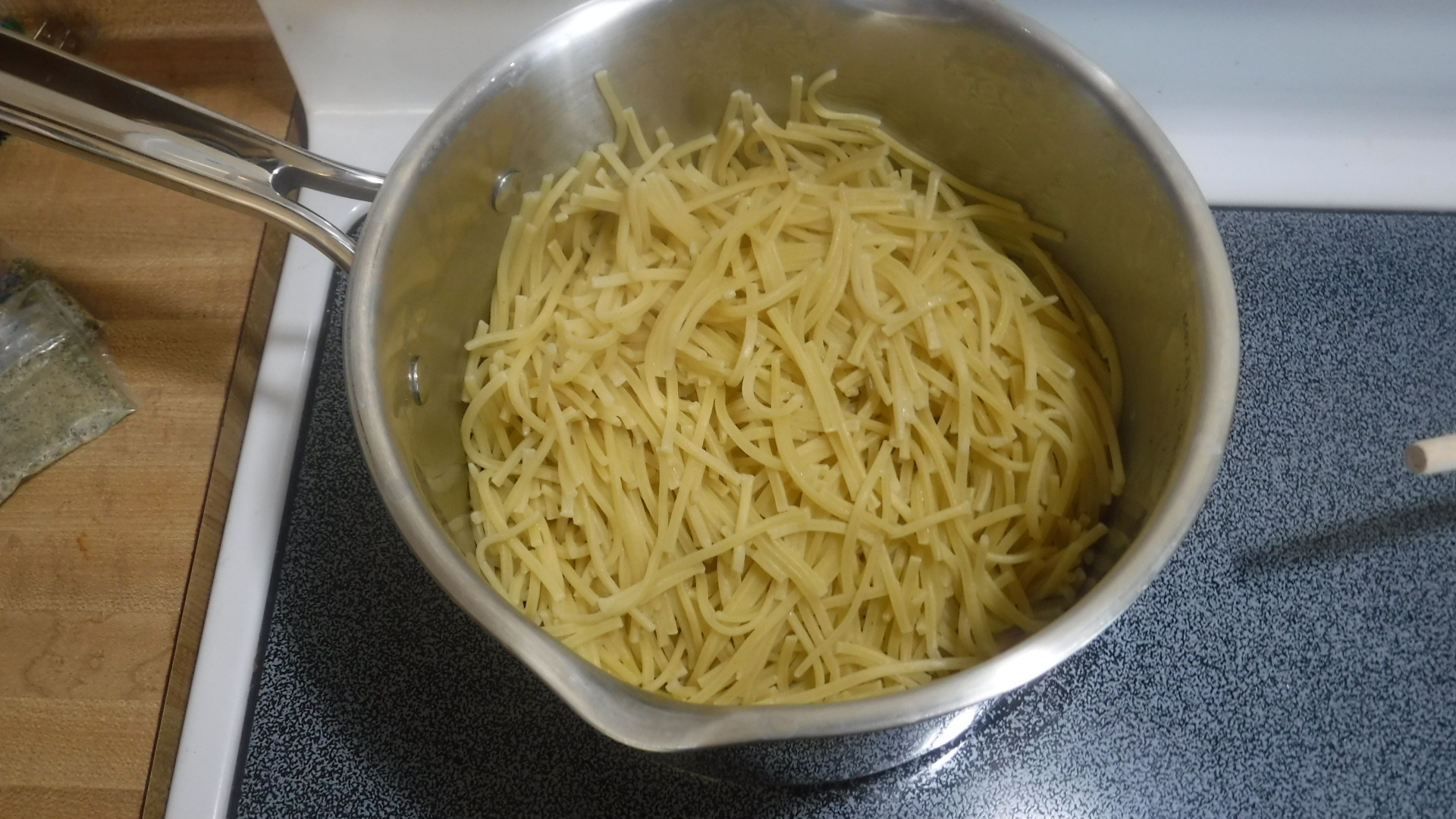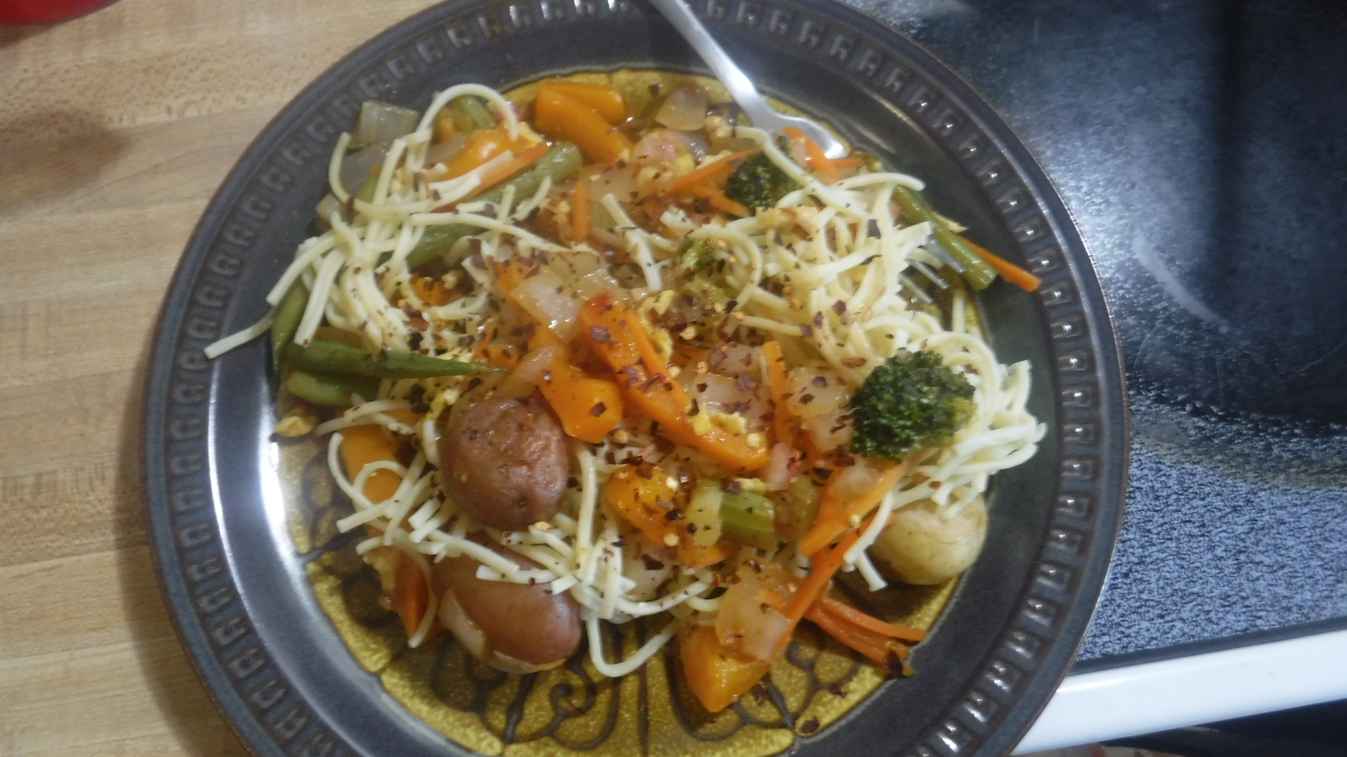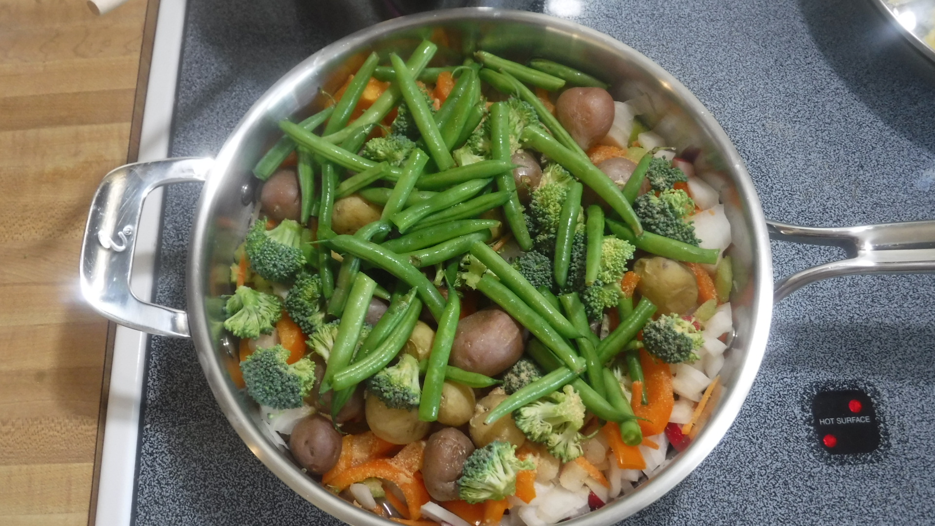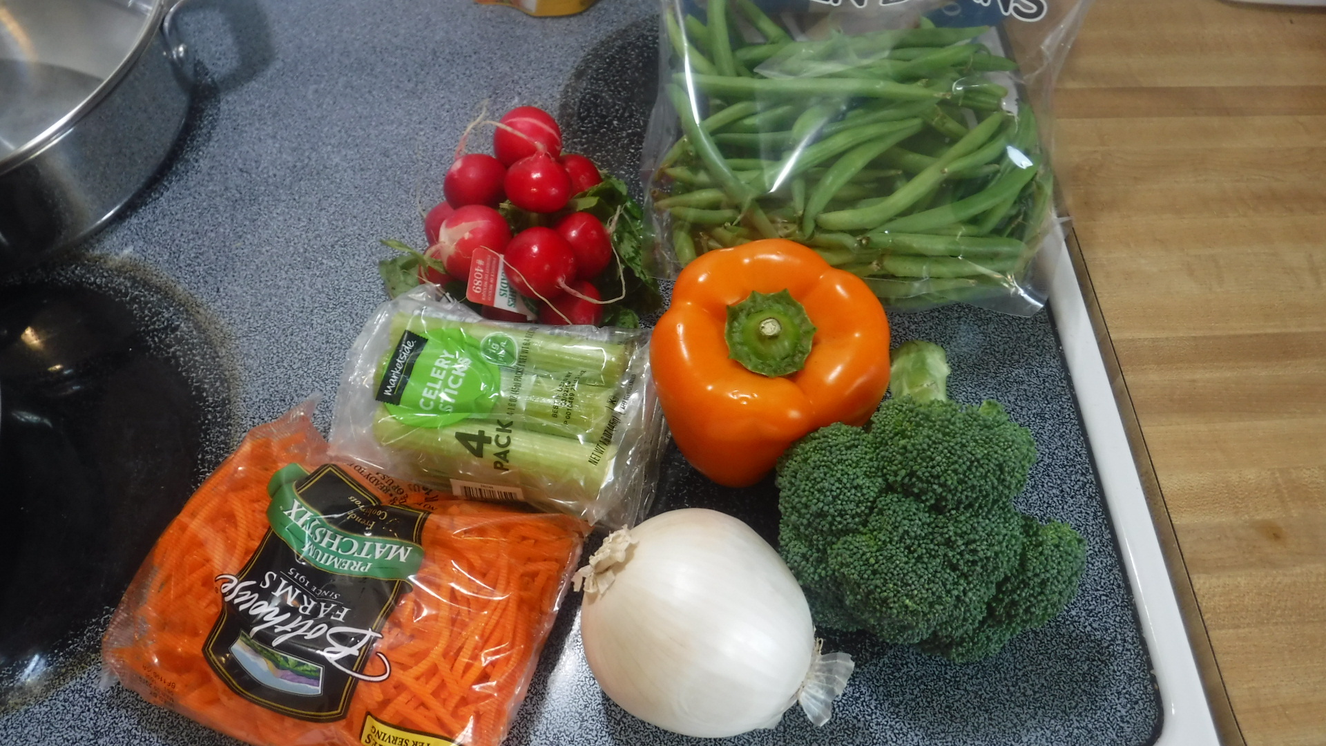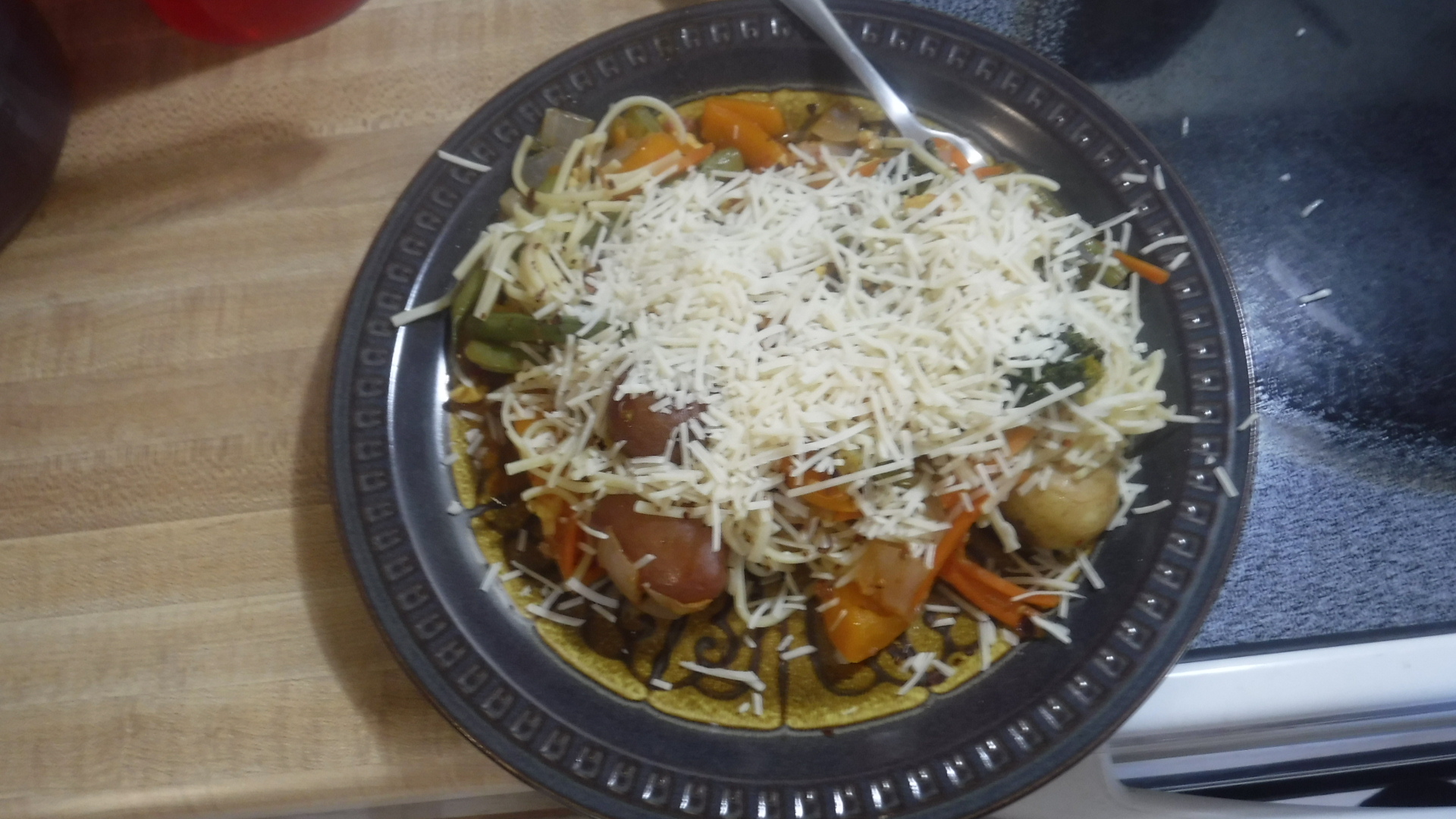 I chopped the vegetables up while the noodles were cooking. Had the veggies in a stainless steel fry pan.