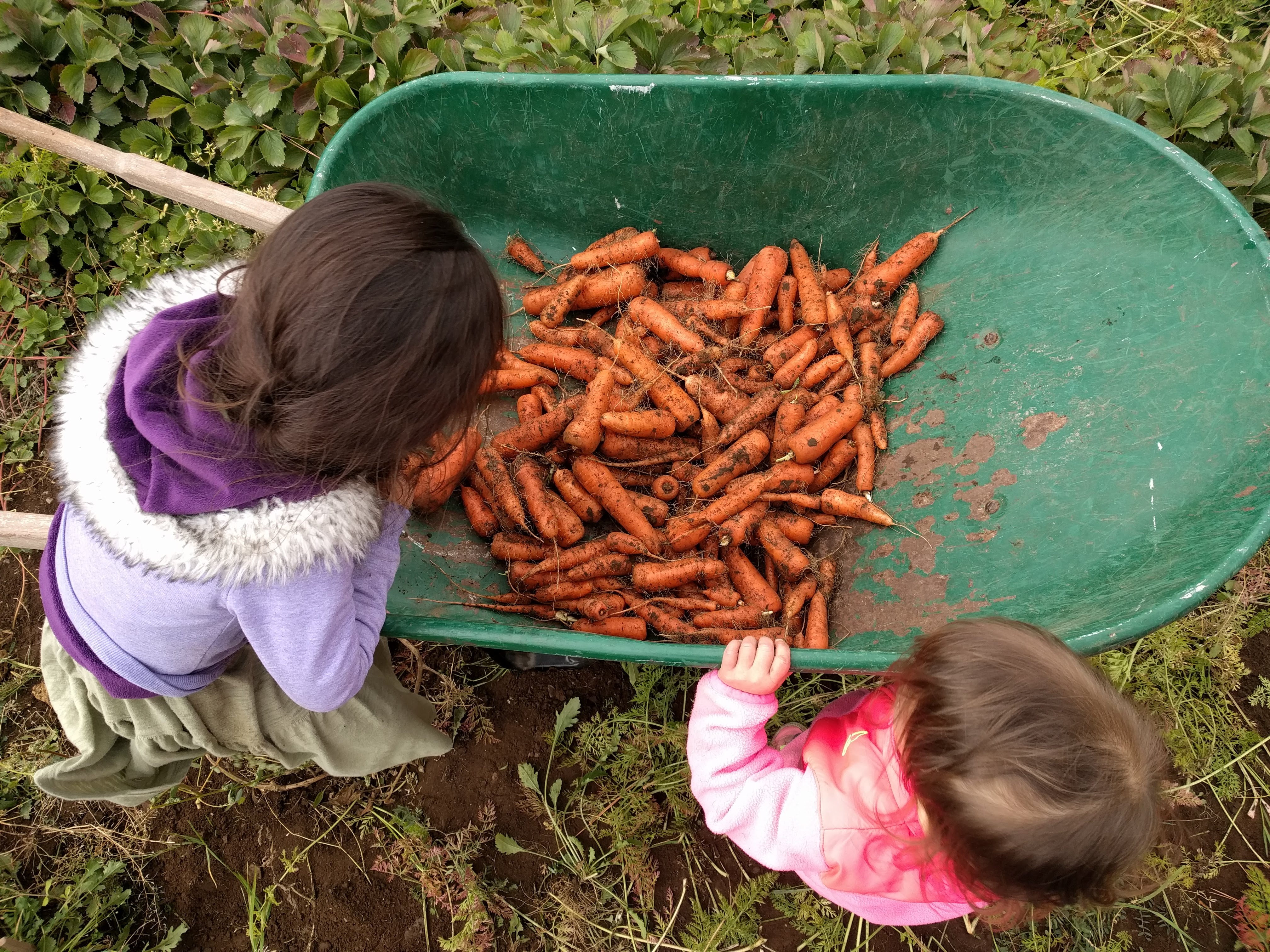 After about an hour we had a nice pile of carrots. We cut off the tops and loaded them in the wheelbarrow. Its hard to say how many carrots were eaten before we were done working. The girls ate them whole, dirt and all!