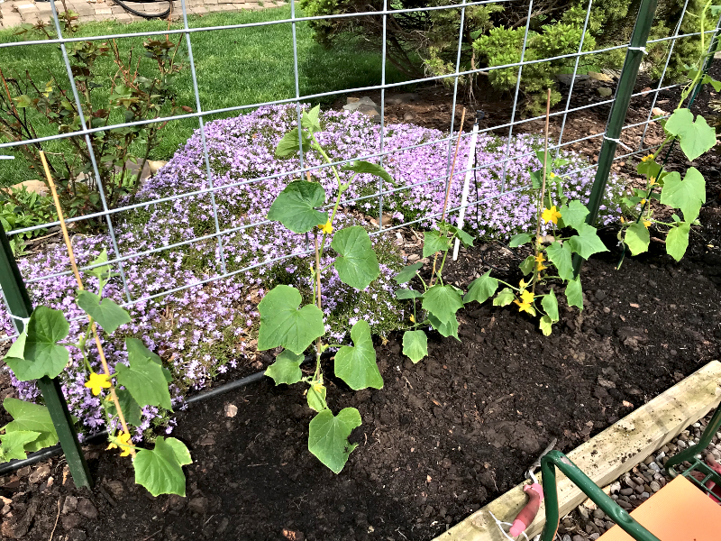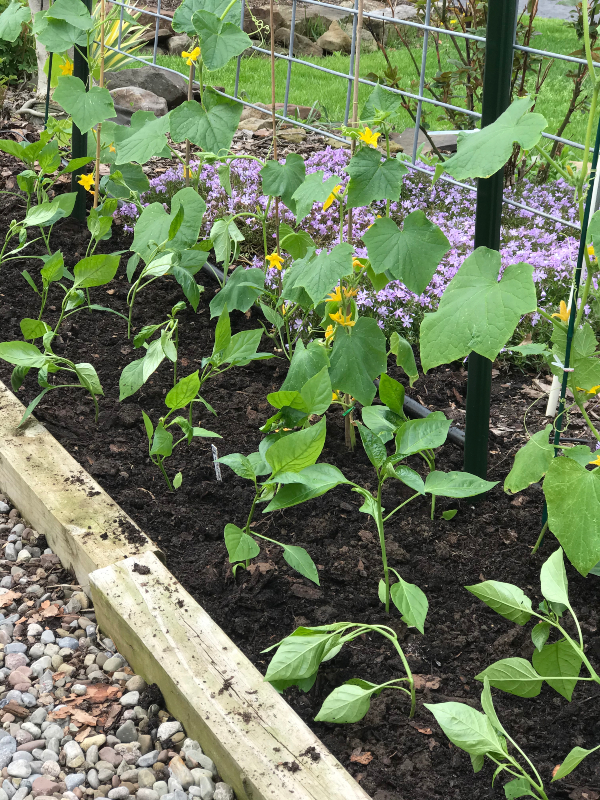 This week the weather has been very warm and sunny. Too hot to plant during the daytime so we started late after dinner to let the roots take hold without the heat of the day. I finally was able to put in the cucumber plants that were growing so tall in the greenhouse and also I underplanted with some red bell peppers.