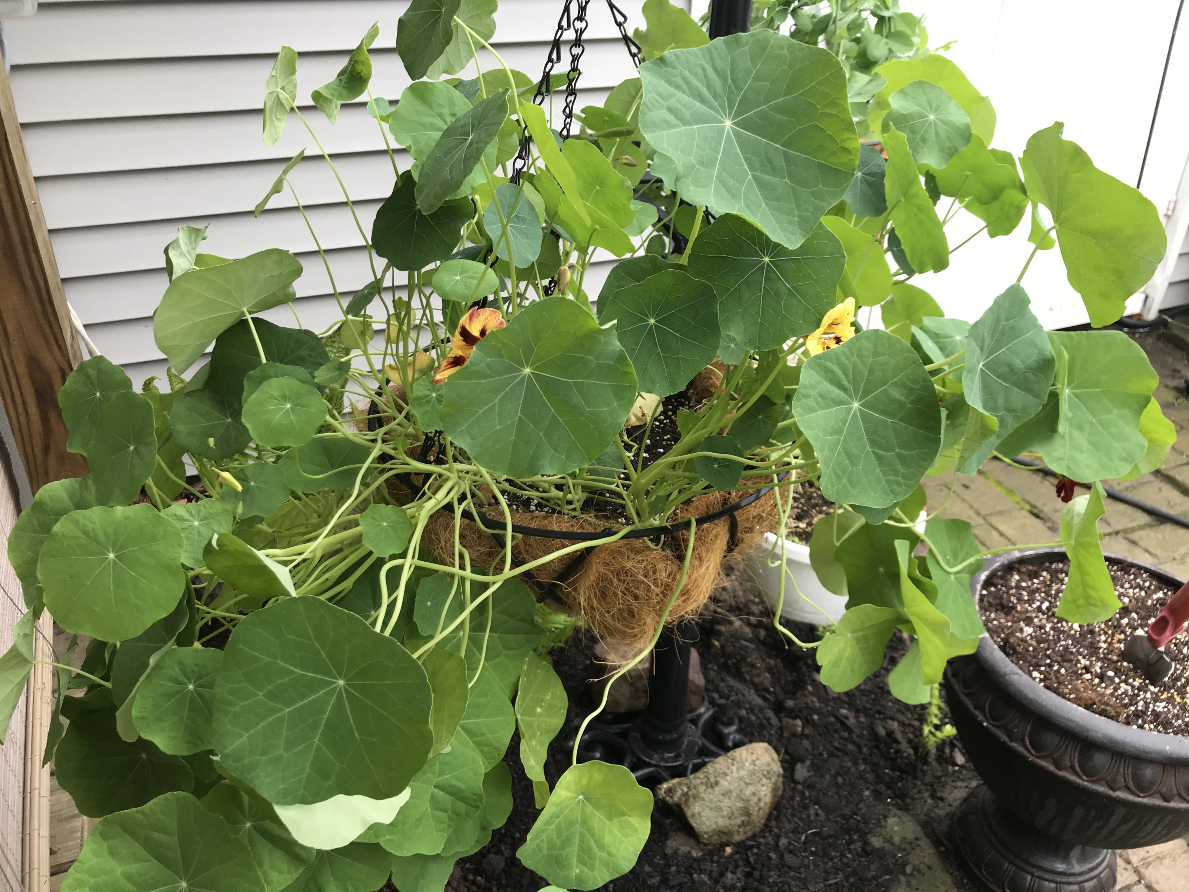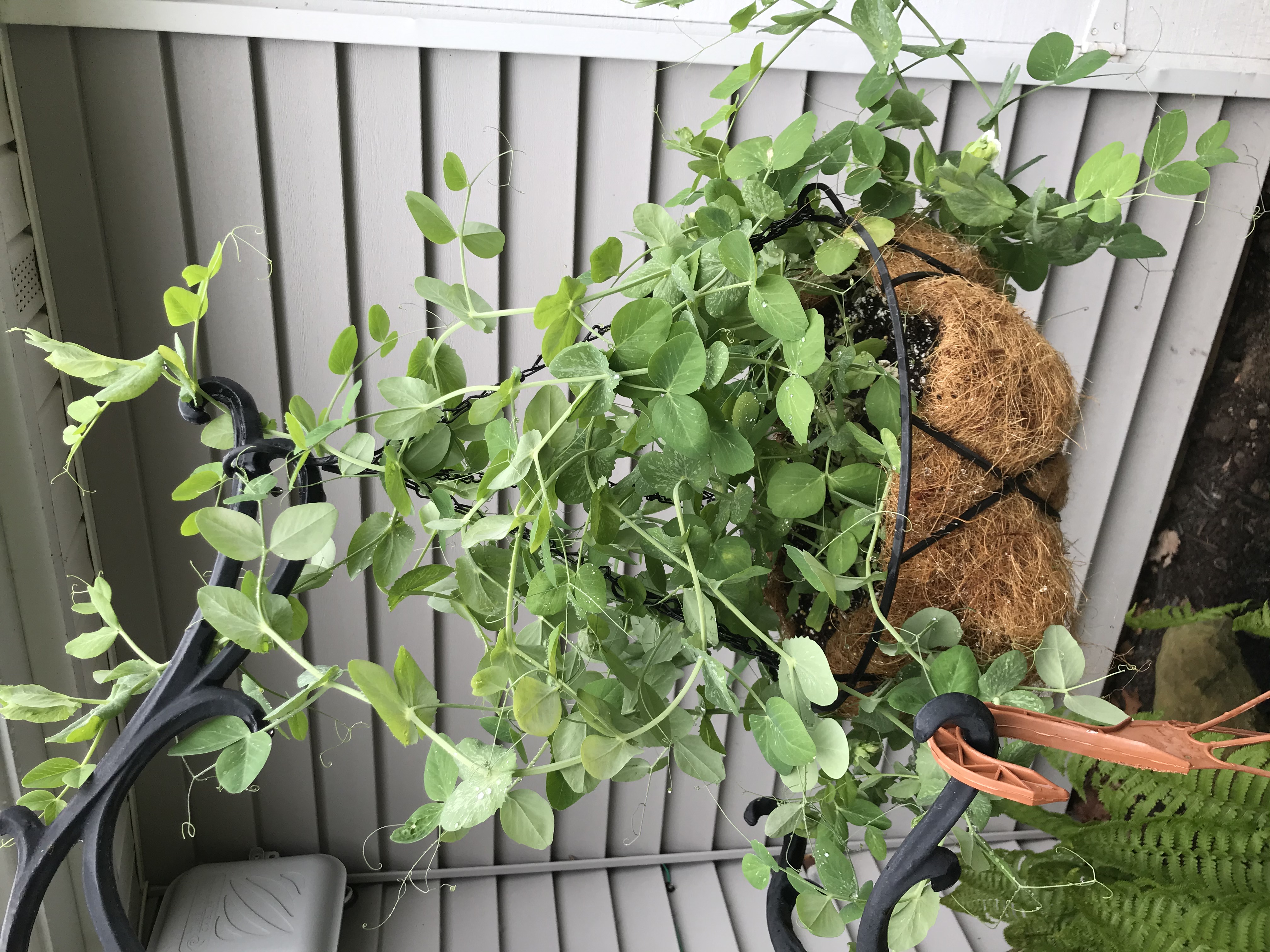 Sweet peas grow well in a hanging basket and I have it right next to the porch for handy picking along with my Nasturtiums. This makes it easy when I want to grab just a little for a salad for dinner.