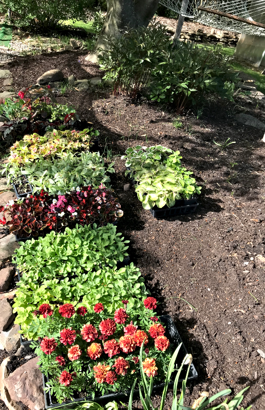Below, a bed has been topdressed with leaf mulch and prepared for the flats of flowers that will fill in this entire area. This is my sweet spot where I lay in my hammock and imagine my day away with all the surrounding nature sounds.