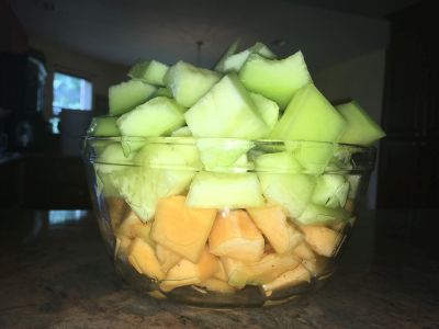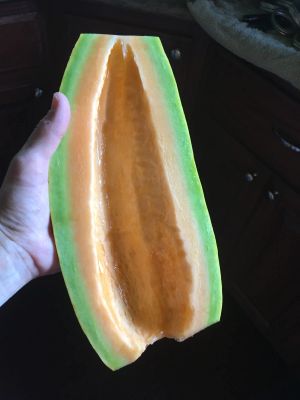 Finally we found an orange one. These melons in the bowl are the same kind of melon, one is crossed, the other isn't: