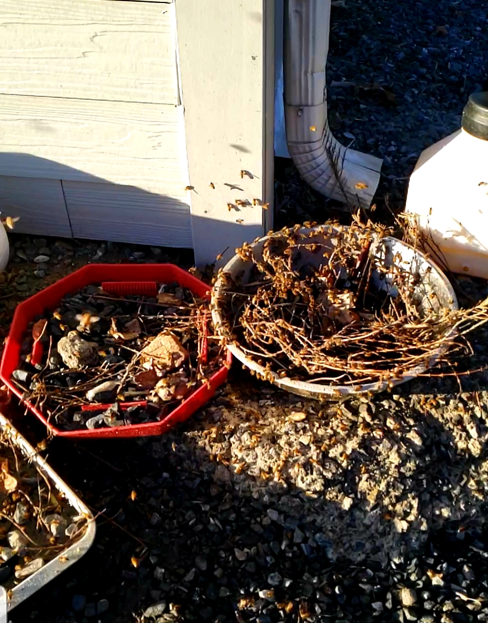 Attached is a picture of an open feeding station I filled up for the honeybees on this beautiful, December day in North Carolina. When the temperature rises above 50 degrees during the winter, the forager bees go looking for food and will fill up on the herbal sugar syrup I make for them. They take the syrup back to their hives to add to their food stores (honey and pollen) that are needed to survive during the winter months ahead when they can't fly to look for food sources.
