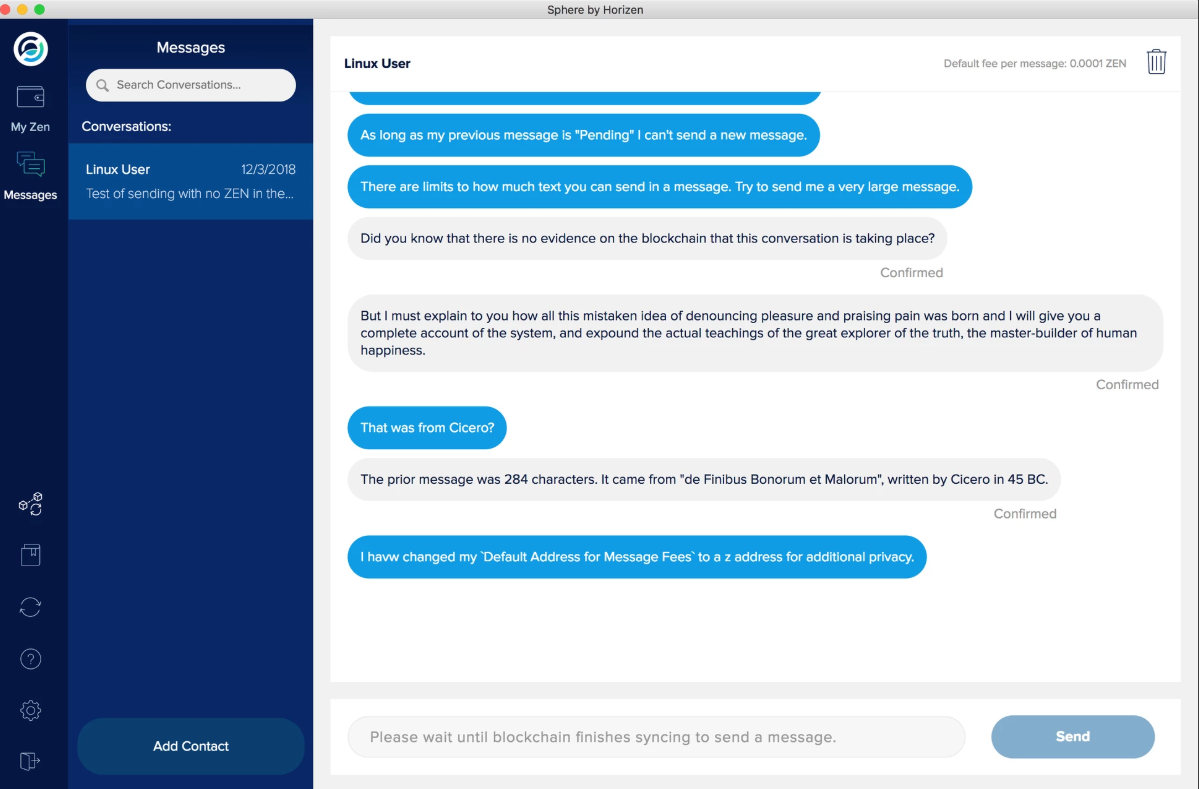 Sphere by Horizen je višenamenska aplikacija koja omogućava korisnicima da preuzmu kontrolu nad svojom privatnošću i financijama. Ovo je početna tačka za većinu Horizen usluga, omogućuje Vam potpuno zaštićeno dopisivanje korišćenjem "zk-SNARKs" tehnologije, okruženje je veoma otmeno sto je drastična razlika u odnosu na predhodne proizvode. Možete slati poruke osobama koje poznajete ili možete čatovati sa potpunim strancima i vaša privatnost neće biti ugrožena. Podržava i transparentne i zaštićene transakcije jer ovo je novčanik koje radi u oba moda kao „full node“ i „lite novčanik“ i u bliskoj budućnosti možemo očekivati izdanja za Andoid i IOS.