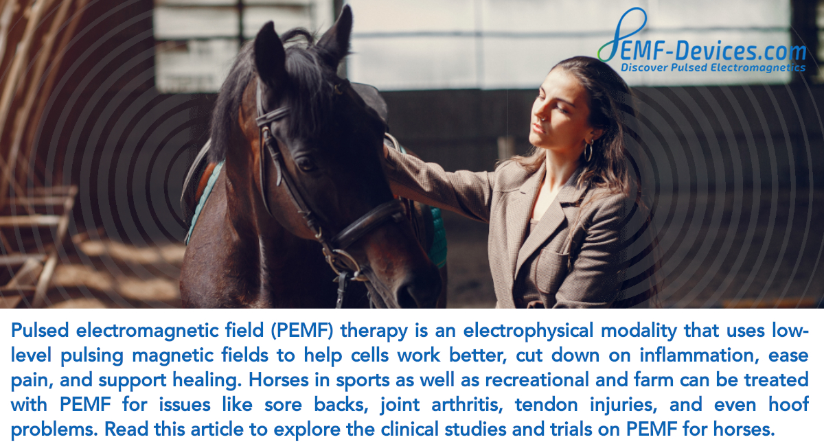 This is a practical guide & a comprehensive research review on Pulsed Electromagnetic Field Therapy for equines. All about Equine PEMF for sore back, bone repair, tendon injuries, thin soles and more based on published studies from reputed journals. Read article on PEMF-devices.com here: https://pemf-devices.com/pulsed-electromagnetic-field-equines-horse-research/
