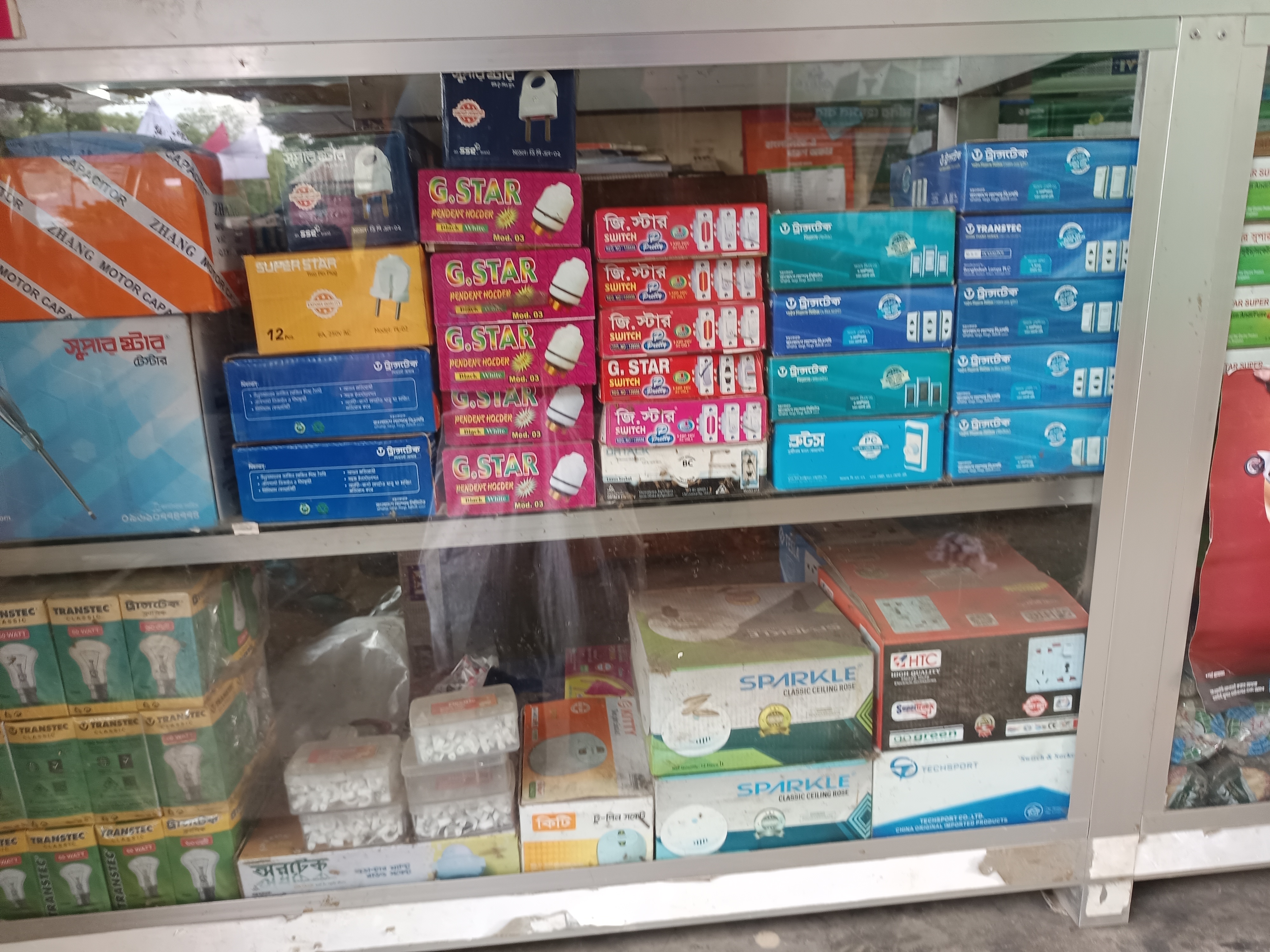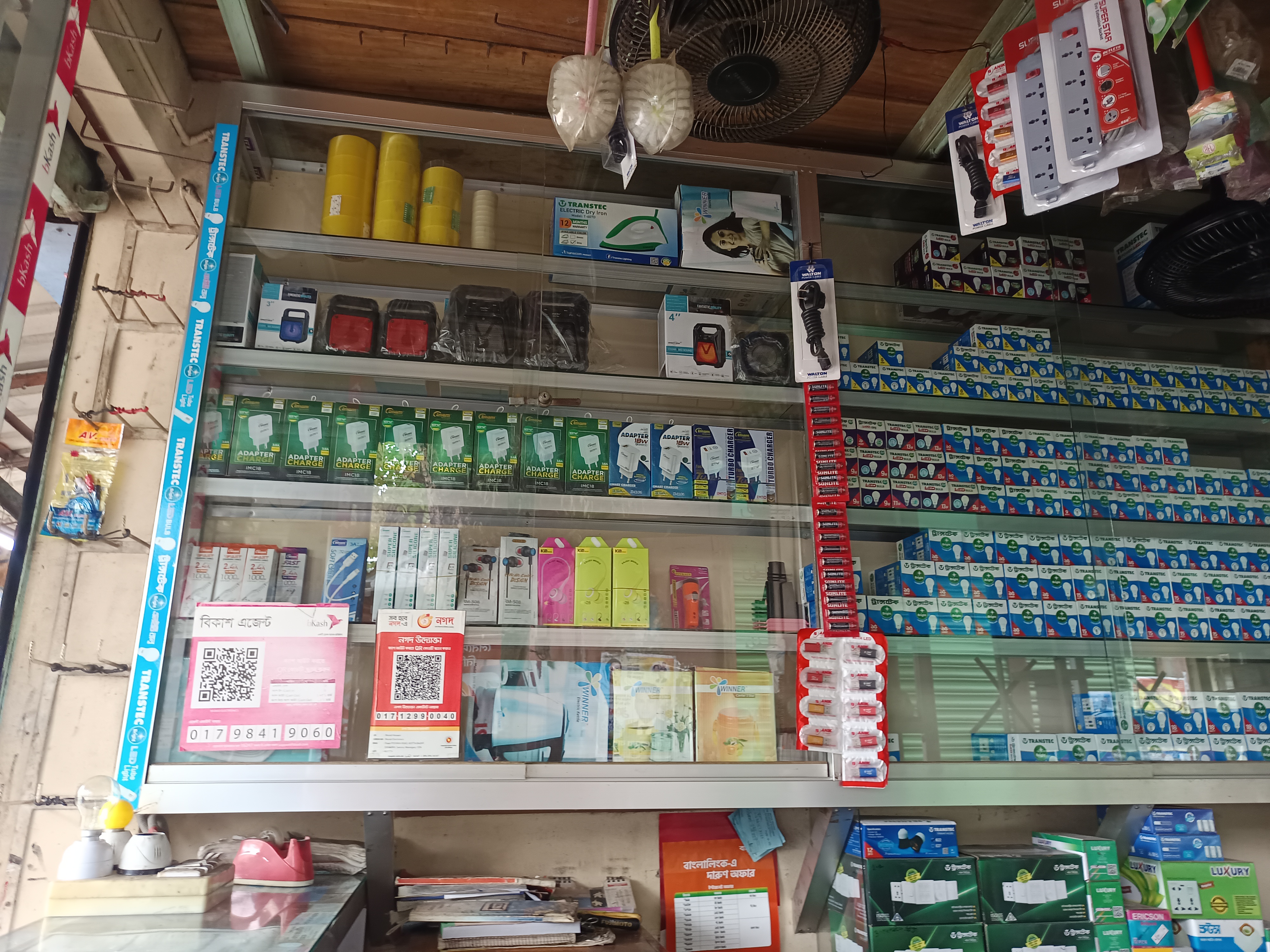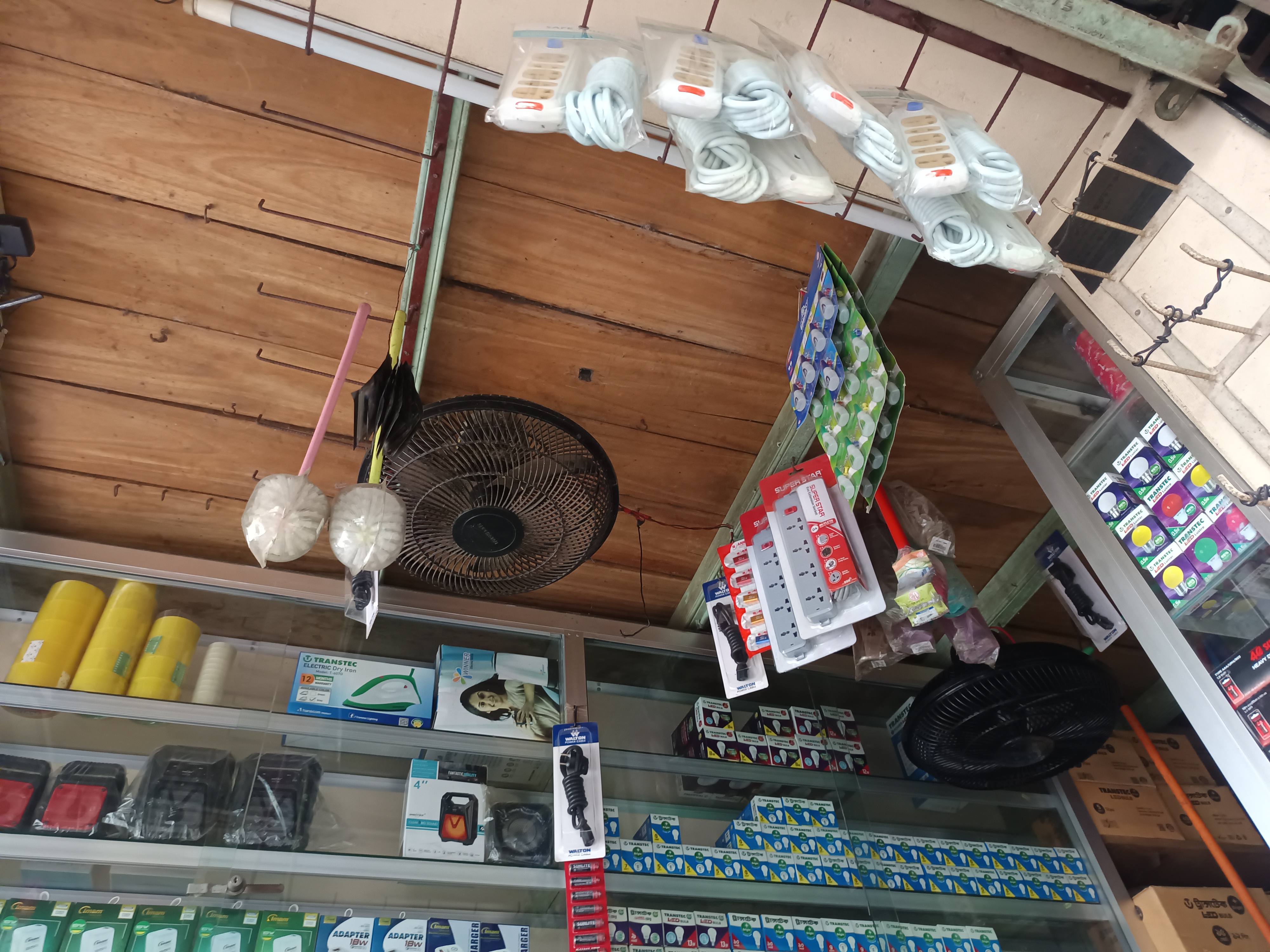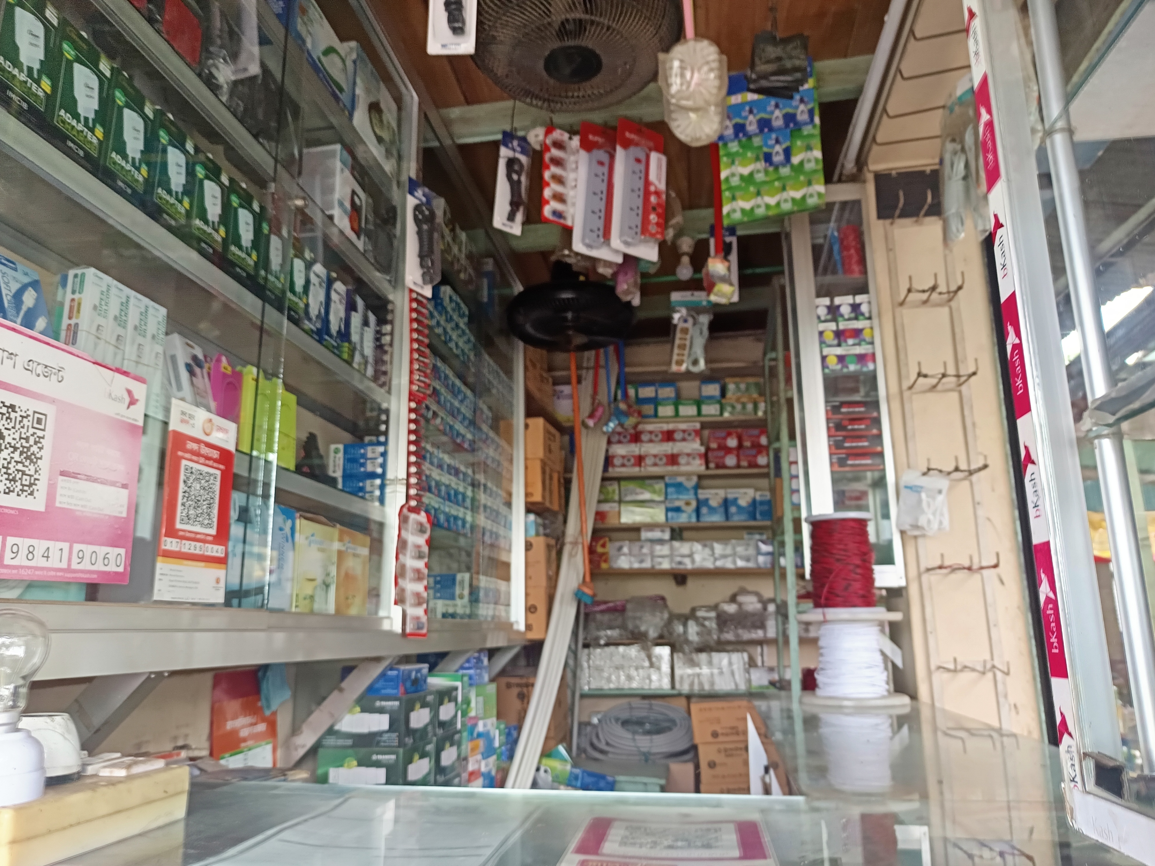 I have taken pictures around this store. Everything is very nicely arranged. I looked up and saw that there are cage fans for buying and selling, and there are also multiplugs from which several lines of current can be connected. All these things are very nicely arranged. To show you. I have taken these pictures that will be very good in my own way. Thank you very much for being with me. You will see such a good electronics store and you will shop. Where you can buy some good products at a low price. We should shop there.