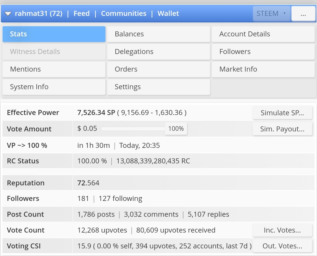 Mulai dari mei 2021 aku bergabung hingga saat ini aku masih konsisten dalam hal membuat postingan setiap hari nya, baik itu mengikuti kontes setiap komunitas maupun kontes steemit Engagement Challenge dan aku juga selalu rutin dalam melakukan power up. Berbicara tentang akun alhamdulillah aku sudah mempunyai reputasi 72.564, voting csi 15.9 (0.00 % self, 394 upvotes, 252 accounts, last 7 d) dan 9,156.576 steem power. Ini salah satu hasil dari kerja keras mulai dari 2021 hingga saat ini dan semoga aku menjadi lumba-lumba di akhir tahun Karna ini akan menjadi apresiasi yang luar biasa atas pencapaian ku di tahun ini.
