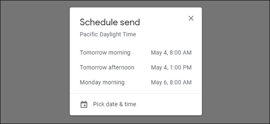Tell Gmail when you want to send the email. You can pick a time like “tomorrow morning” or provide a custom date and time.