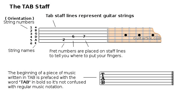 Although TAB is not considered to be accurate because of many reasons but the most salient of all is that accurate interpretation might not be easy for a novice. Accuracy in rest, timing and many other factors. The TAB lines are just exactly like the guitar strings only that on a TAB diagram, the thinnest string, also known as 1st string is at the top while the thickest also known as the 6th string is at the bottom and guitar music is always written in this manner as shown above.