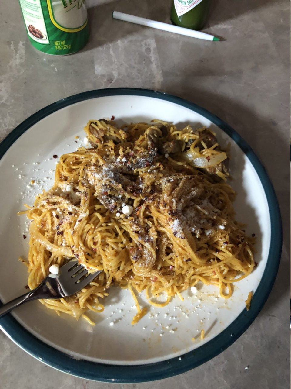 Et gen spageti ak sausis nan kay la.