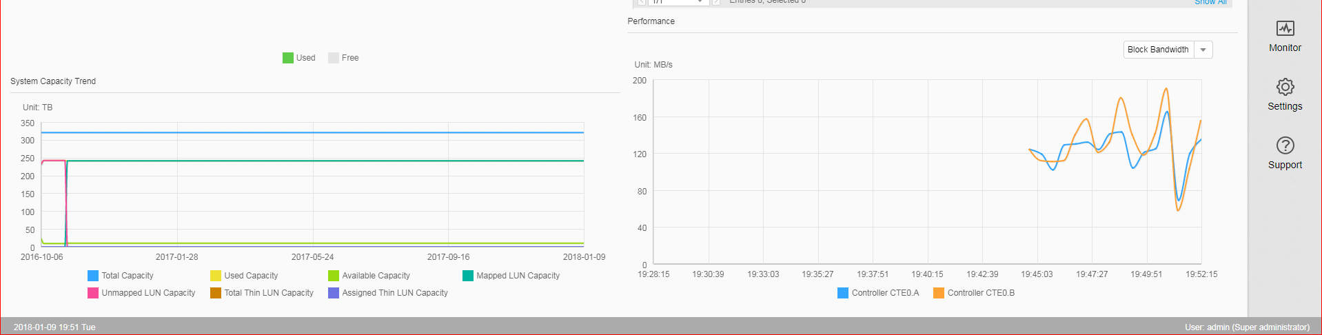 Dalla console è possibile controllare le performance dello storage e gli allarmi di sistema.