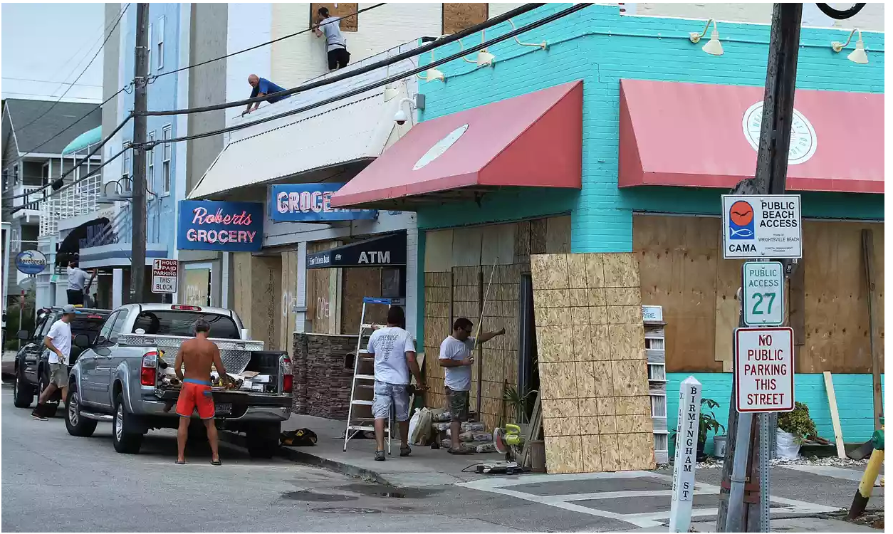 Workers boarding up shops in Wrightsville Beach